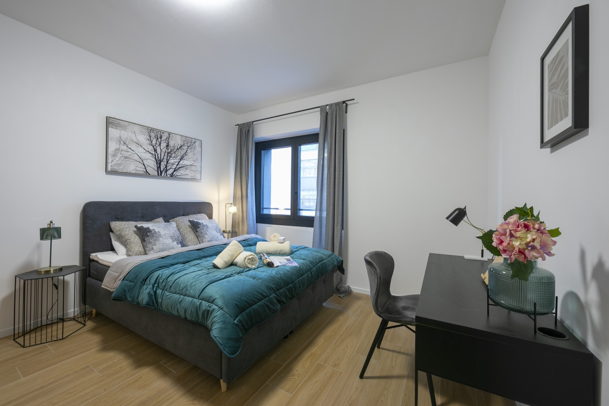 Bedroom 1: The bright master bedroom has a comfortable double bed, spacious storage, a large desk, with a lamp and chair, which can be used as a work station.