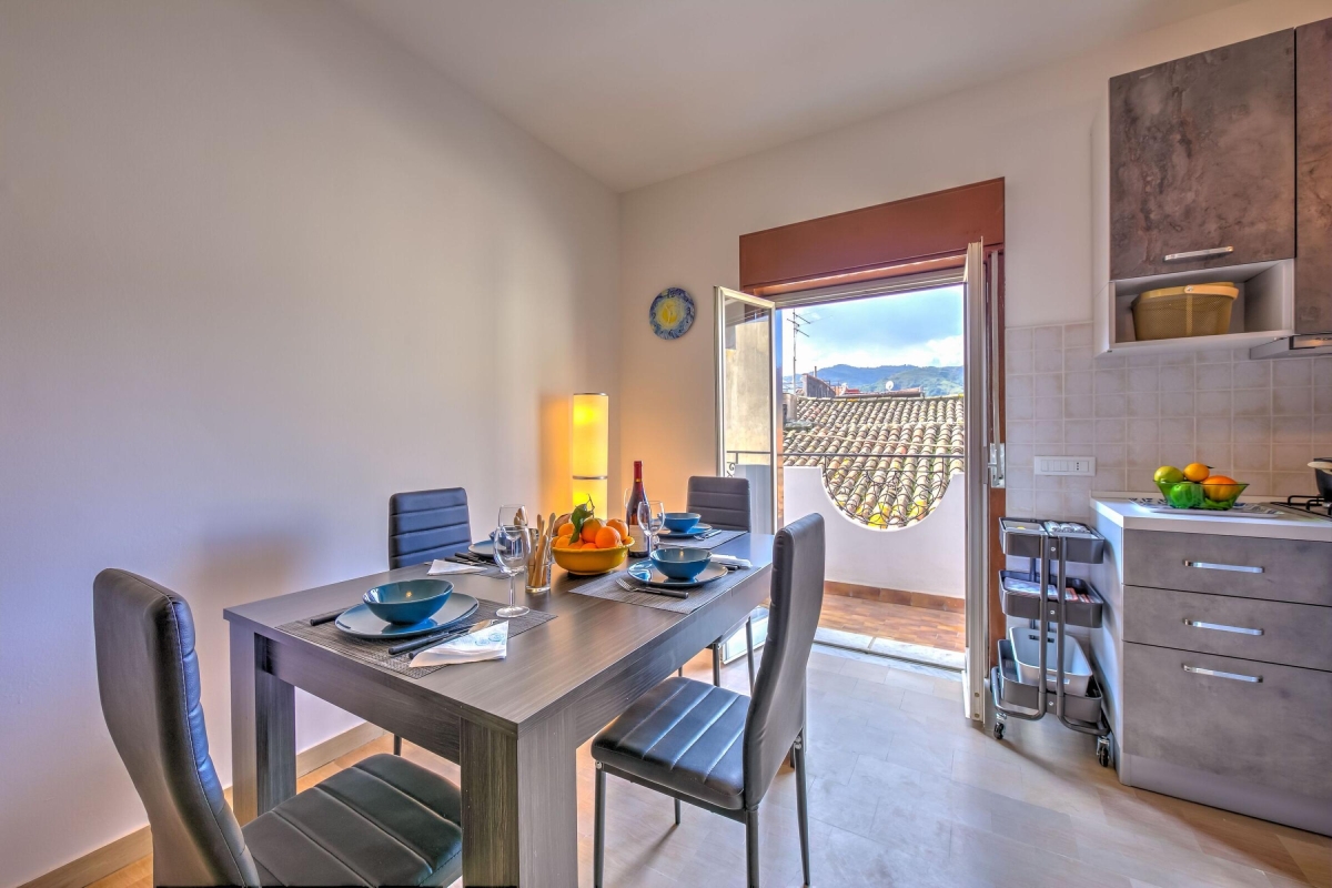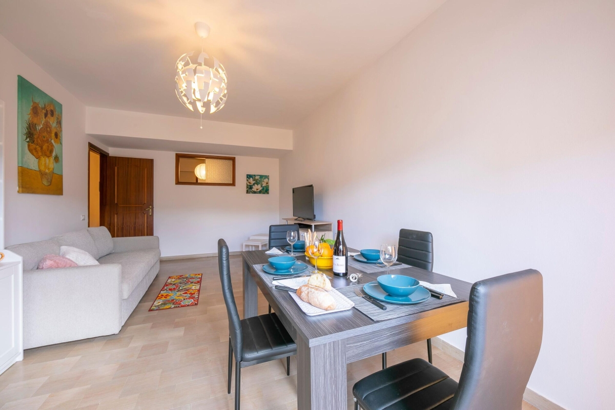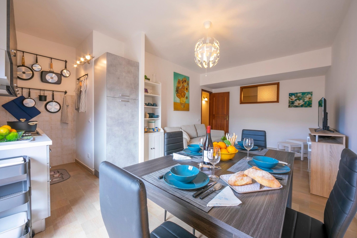 The entrance door leads to the hallway from which continuing on the right you enter the kitchen / living room consists of: double sofa bed where in front there is a cupboard with the smart TV to cheer your hours of relaxation. On the right the dining area with a dining table and the kitchen complete with utensils, oven, PC, Mokka coffee maker, toaster, refrigerator.