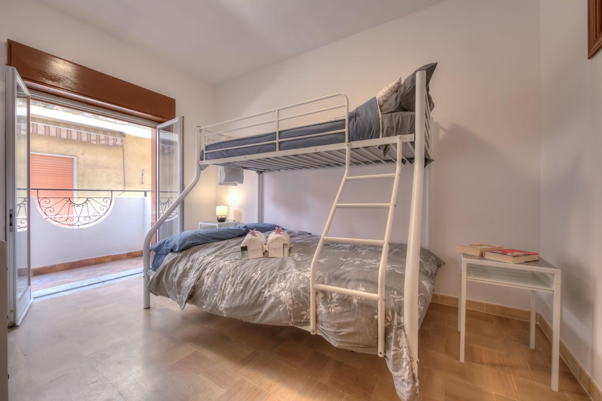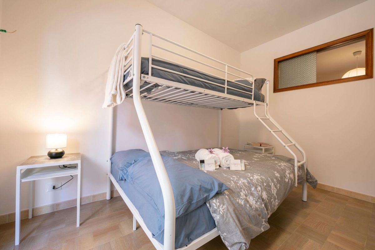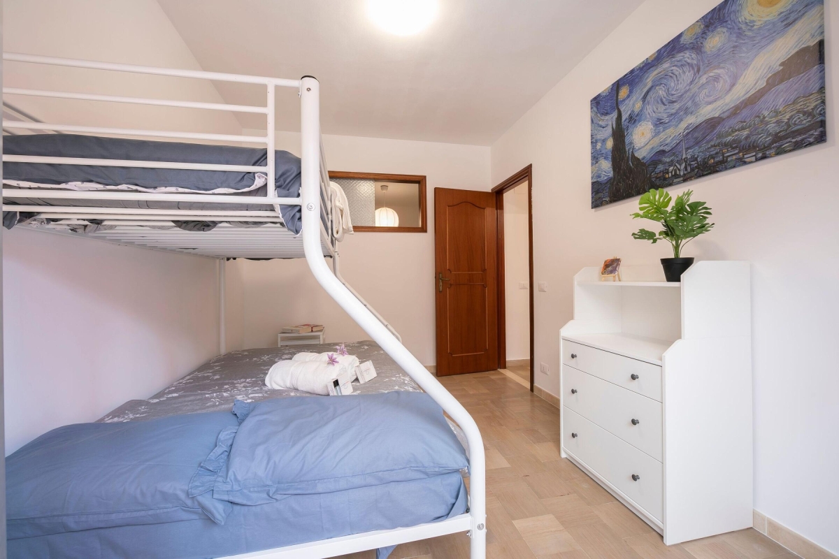 The second bedroom consists of a bunk bed, the lower bed is a double bed and the upper bed is a single bed. Also here there is a wardrobe.