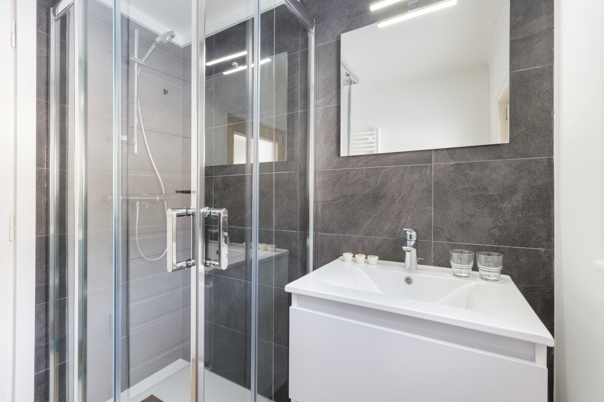 There are 3 bathrooms inside the chalet: the first has a bath and toilet, the second has a bath with shower and toilet, and the third bathroom has a shower and toilet.