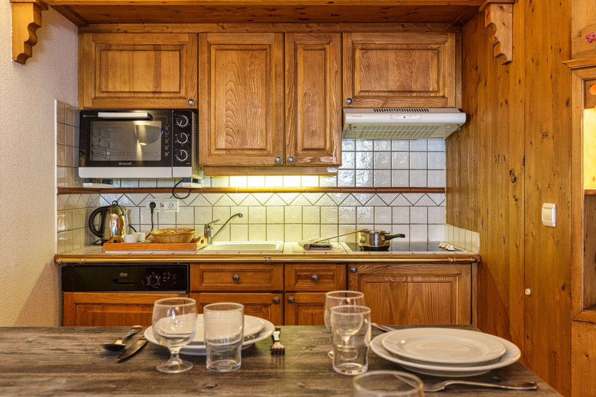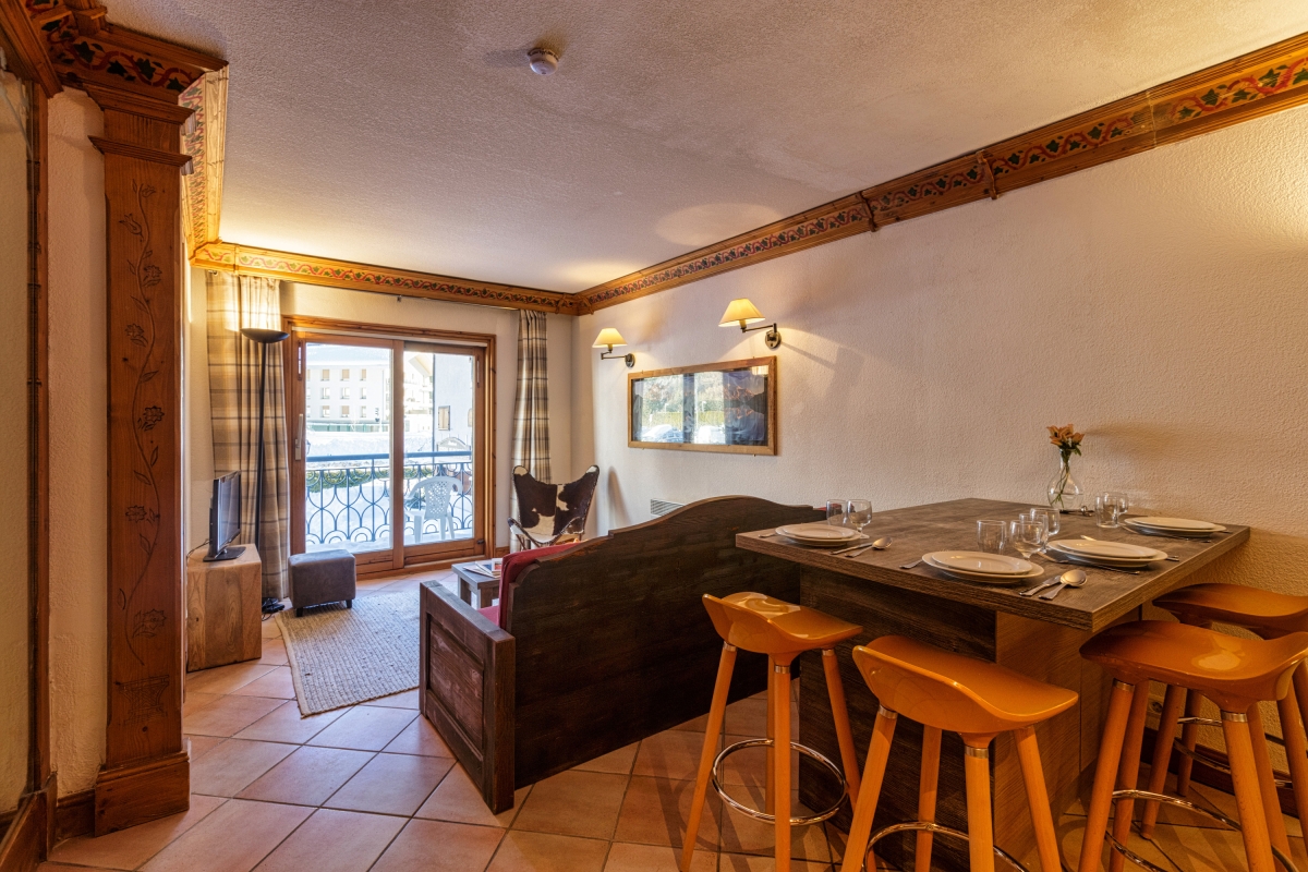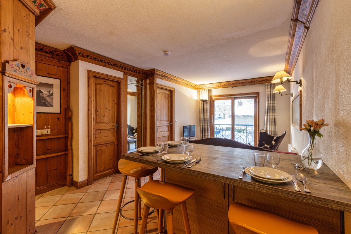 This charming first floor apartment is traditionally decorated but with modern touches. It comfortably sleeps 4 people. The living area, with an open-plan kitchen, makes the ideal space for relaxing and hanging out with friends or family after a day skiing or hiking. There is a comfortable, 3-seater sofa and separate chair next to a sliding glass door that leads from the living room to the large, private balcony. The balcony has a table and two chairs, where you can sit in the summer months. Indoors there is a wooden breakfast bar that seats 4, next to the well-equipped kitchen. The kitchen has an induction hob, fridge, dishwasher and drip coffee machine, for stress-free self-catering.