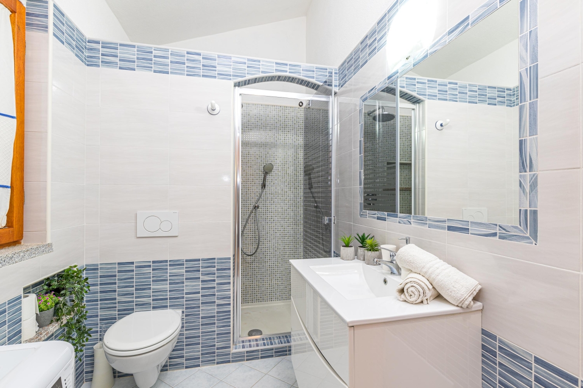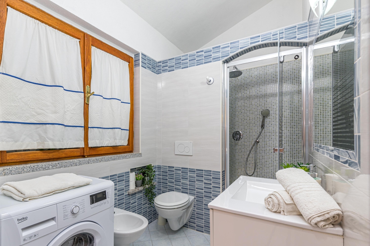 The tiled bathroom is equipped with a shower, bidet, basin, WC and washing machine.