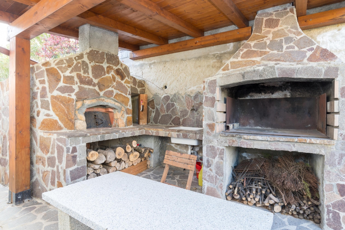 The airy open plan living area has a sofa, traditional corner fireplace (not in use), flatscreen TV, pretty white dining table and a newly fitted kitchen. The kitchen is equipped with a cooker hob, oven, fridge/freezer and a moka coffee maker. Glass doors lead from the living room to a beautiful, shaded terrace, where guests can dine al fresco and enjoy unrivalled views over the sea. There is second veranda with a large BBQ and stone table.