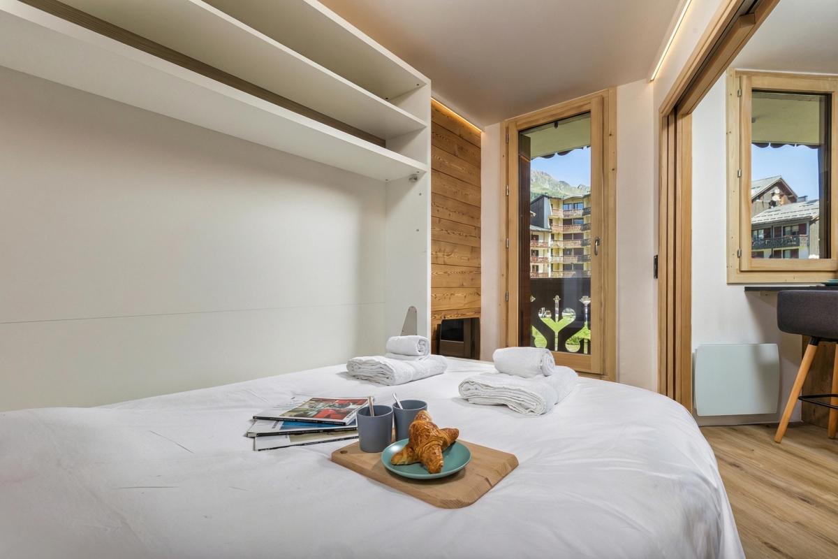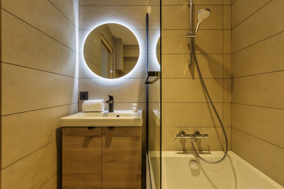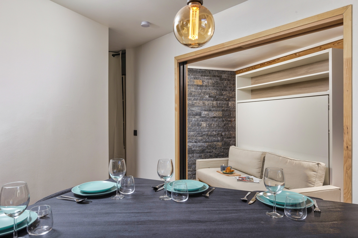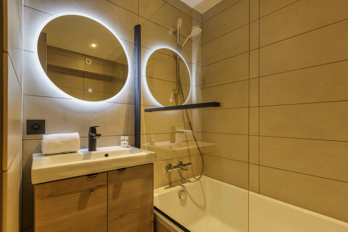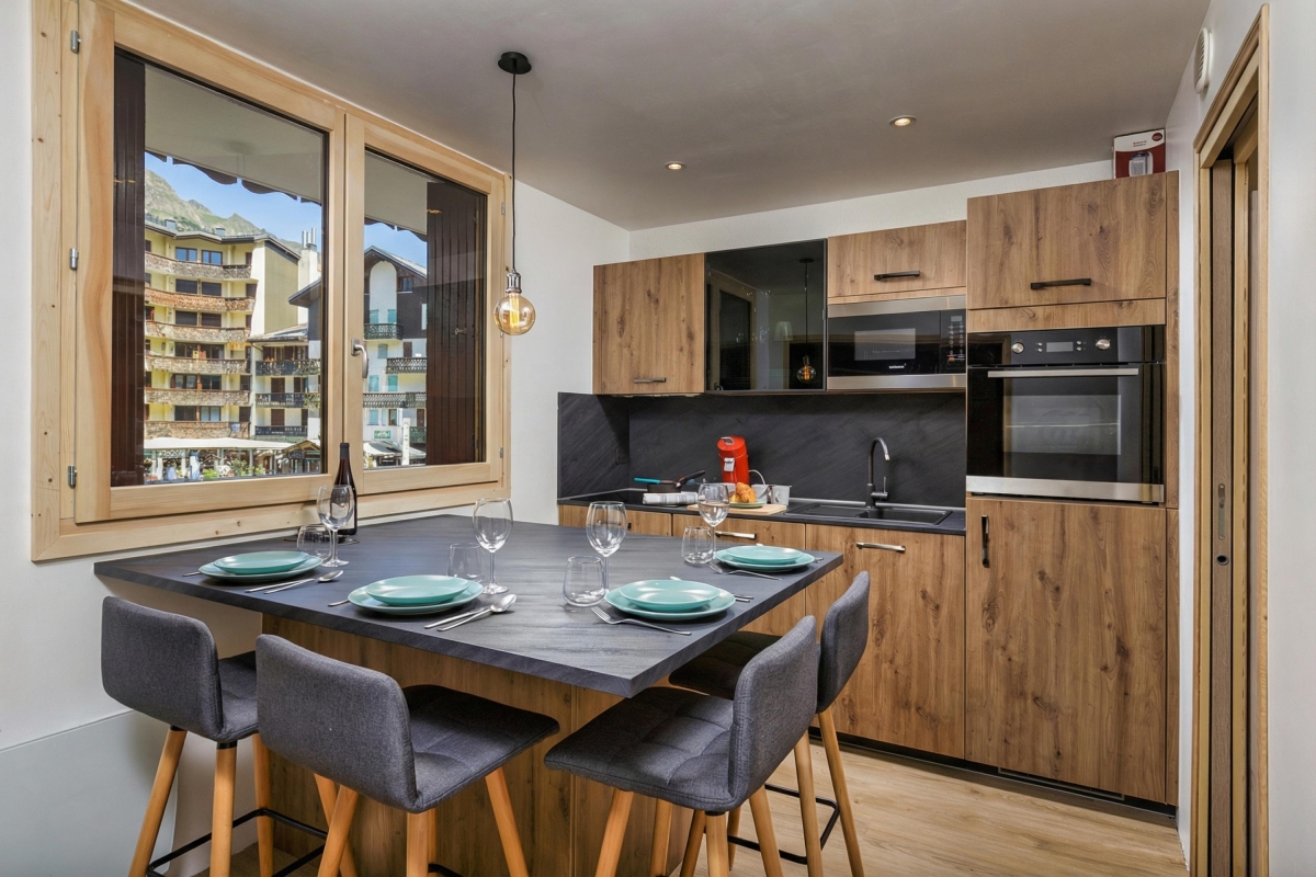 The apartment has a contemporary alpine décor, with modern furniture and wooden accents. There is a comfortable sitting room, with wooden and stone panelling and a double sofa in front of a large, flatscreen TV and a glass door that leads onto the balcony. The separate kitchen/dining room is attractively decorated in with a stone table and 4 raised dining chairs. The well-equipped kitchen has with an induction hob, oven, microwave, dishwasher, fridge and coffee machine.