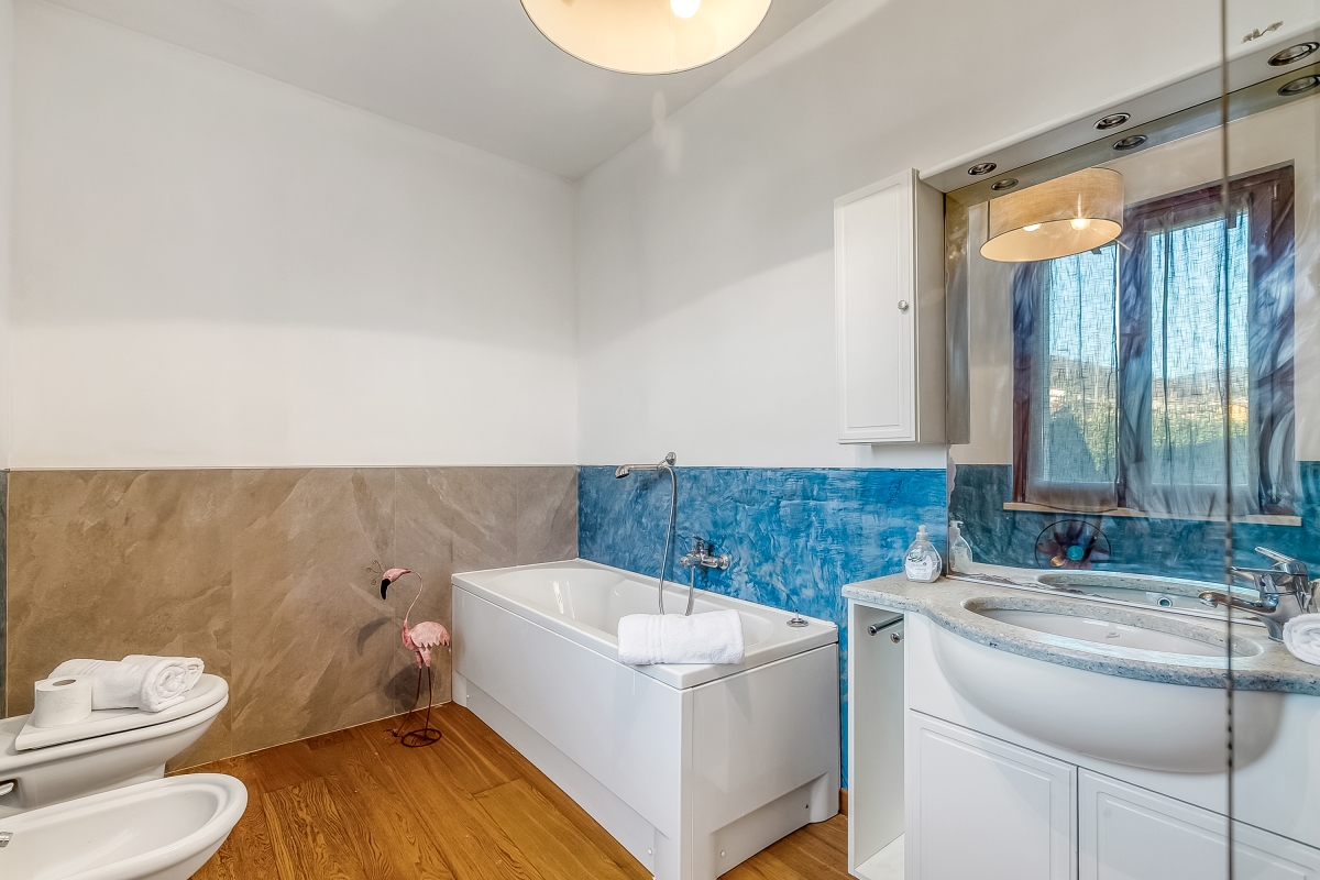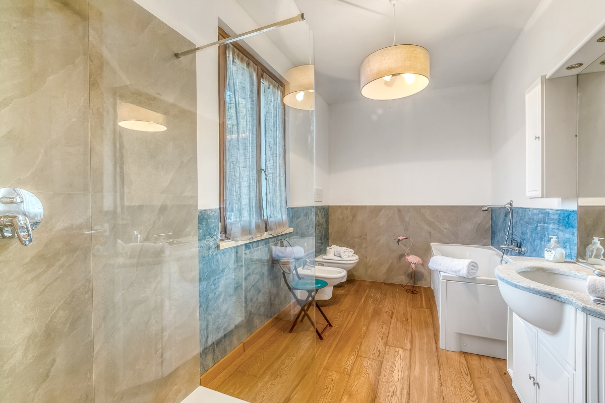 The tiled bathroom is equipped with a shower, bathtub, sink, bidet, and toilet.