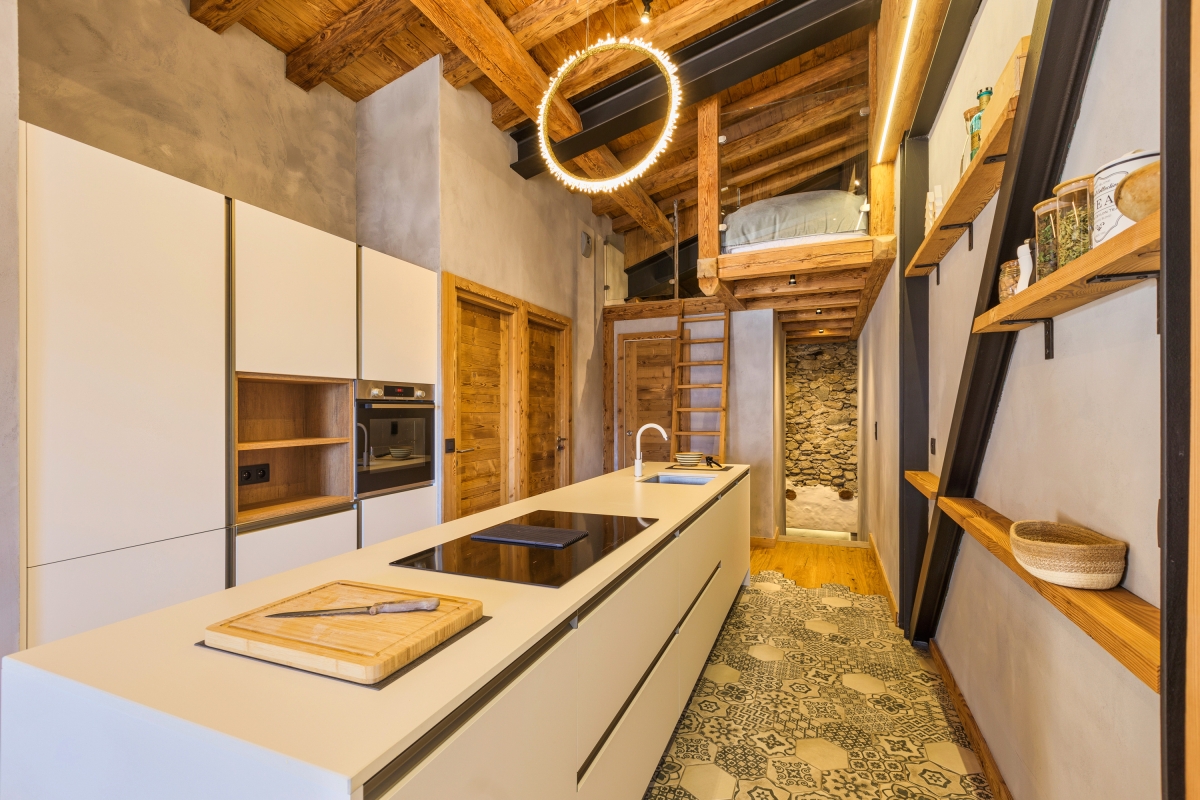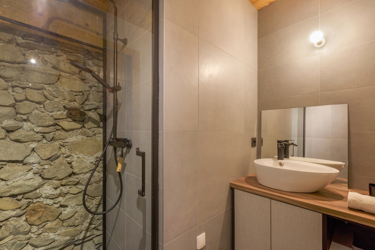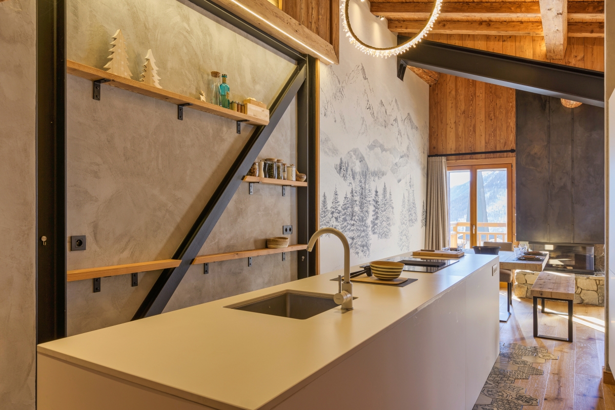 This exceptional apartment sleeps up to 6 people in luxury. The décor is traditional, but with a contemporary twist of industrial chic. Every effort has been made to ensure that guests are as comfortable as possible. The open plan living area has cosy wooden floors and elegant double French windows that lead out onto the private balcony. The views of the Chamonix valley from the balcony will take your breath away. There are two large sofas and a flat-screen, Smart TV in the living room. Next to it is the dining area, with a large wooden table for 6 people. This leads on to the wonderfully minimalist, yet fully-equipped kitchen with an oven, induction hob, dishwasher, fridge and raclette.