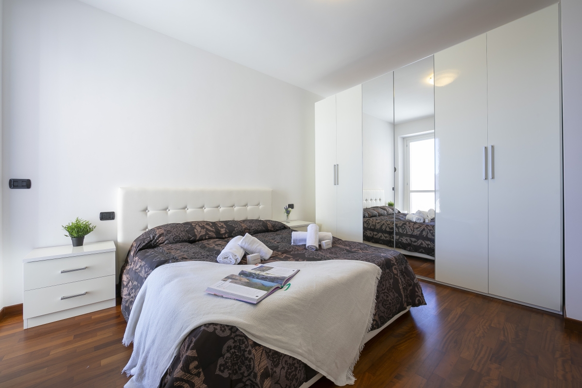 Bedroom 1: A stylish modern bedroom with a king-size double bed, direct terrace access and a wardrobe.
