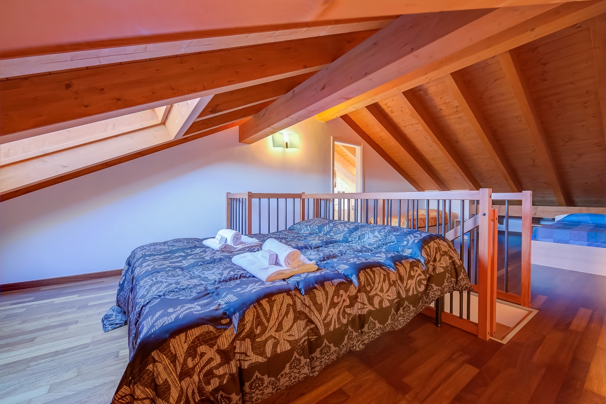 Inside, the modern two-bedroom retreat easily accommodates a group of 6. On the lower level are the living room, dining, kitchen, master bedroom and bathroom; meanwhile, on the upper level, there is a low-roofed penthouse with a sleeping area and another bathroom. The living room offers sun-washed, lake-view interiors to immediately be transported into the holiday mood as soon as you enter the apartment. It has direct balcony access, uninterrupted lake views, a comfy sofa perfect for reading, and contemporary dining with a wall-mounted flat-screen TV. The full, sleek and modern kitchen of the apartment is complete with a chimney and all essential kitchen utilities, including a dishwasher and coffee machine.