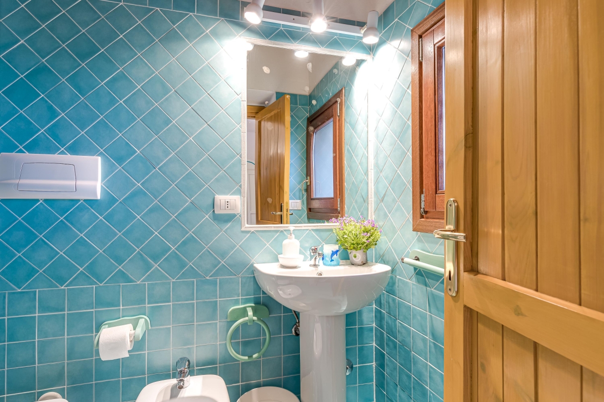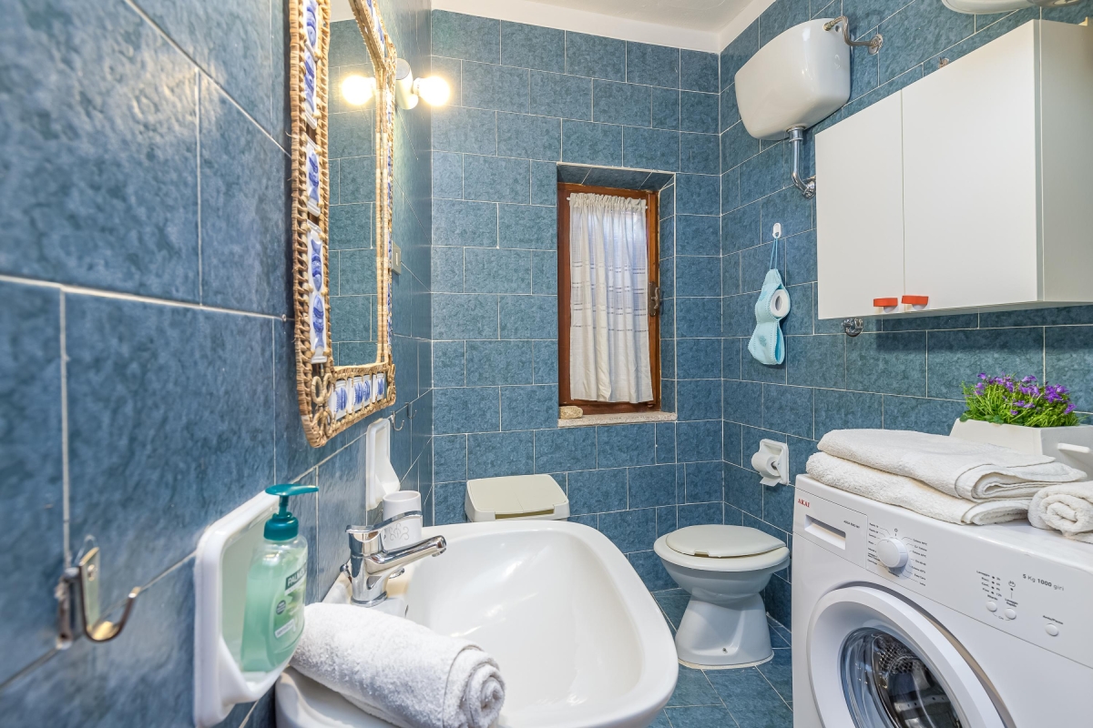 There are two brightly tiled bathrooms. Both have a shower, basin, bidet and WC. One also has a washing machine.