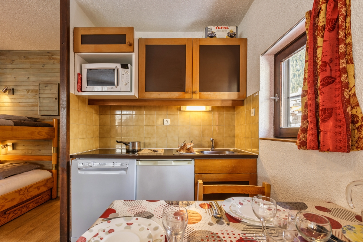 On the first floor of a smart new development, this apartment sleeps 2 adults and 2 children. The living area is lit by a large window, with a glass door that leads onto a private balcony, where there is a table and chairs, allowing guests to relax and enjoy the spectacular mountain views. Indoors, the sitting area has a comfortable sofa, plus a flat-screen tv and a chest of drawers. The neat dining table and chairs are next to the open-plan kitchenette, which is well equipped with a cooker hob, microwave, dishwasher, fridge, toaster and an american style coffee machine.