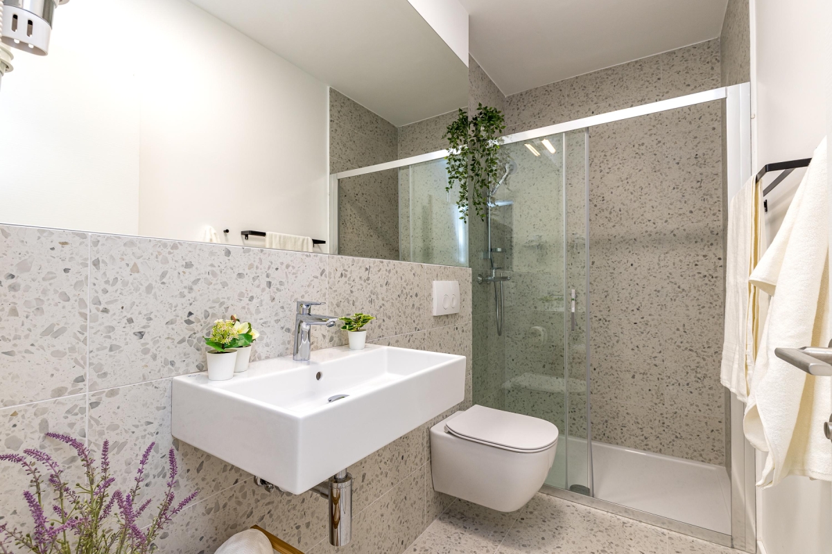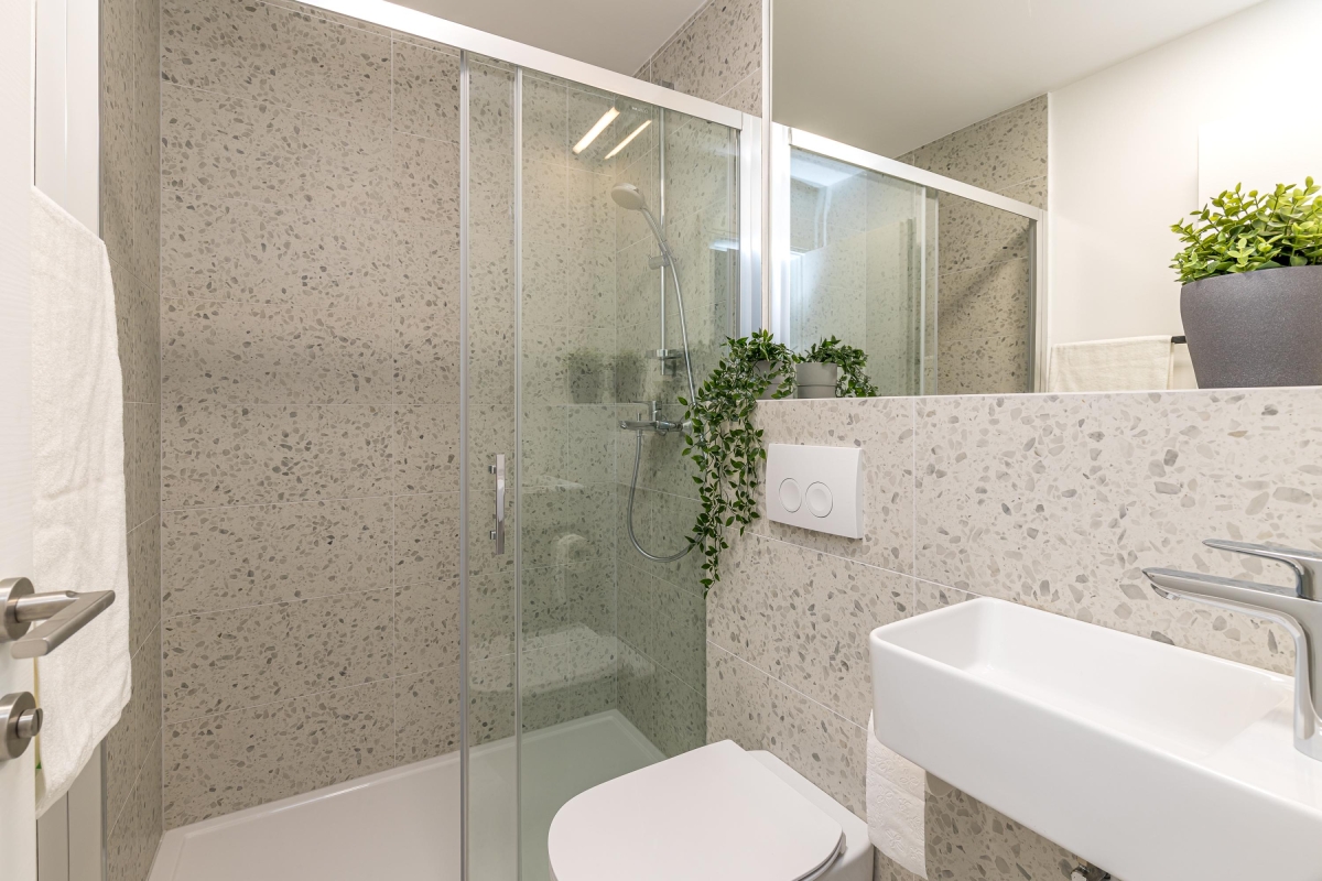 Outside, there is a shared 35-meter-square swimming pool as well as a shared garden and sun loungers to enjoy the apartment’s sunny and peaceful environment.