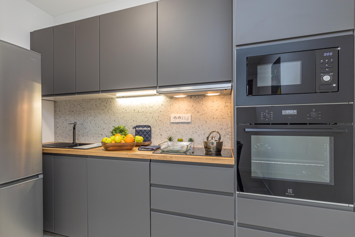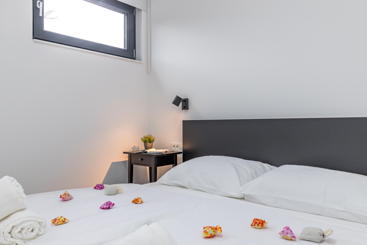 The new and sustainable 2-bedroom holiday apartment is located just a 10-minute walk from the emerald waters of Vela Beach. Inside, the apartment is furnished in a very stylish, contemporary manner. The living room is open and features a comfy lounging area with a Smart TV. Close to the lounging, the dining area is accompanied by a fully-equipped kitchen with a dishwasher, oven, fridge, coffee machine, and cooker hob for a hassle-free stay here.