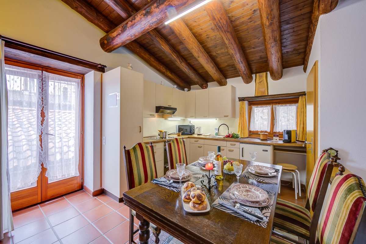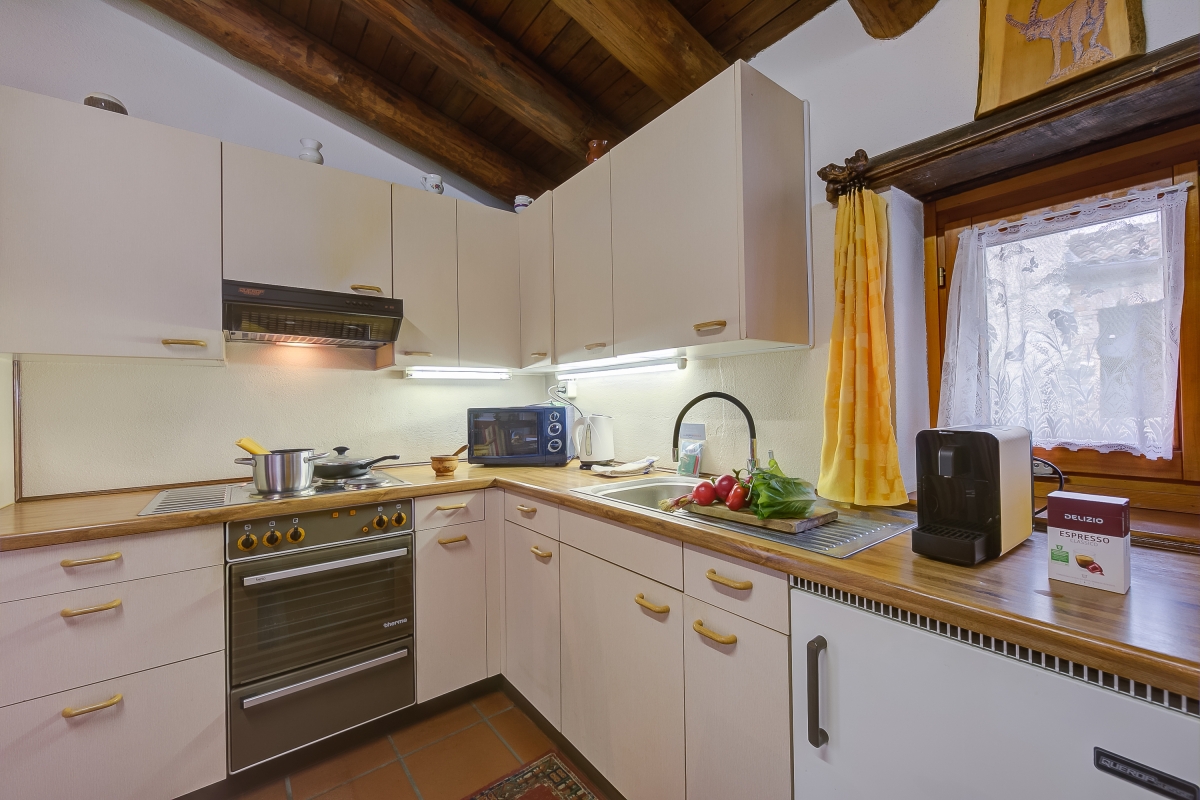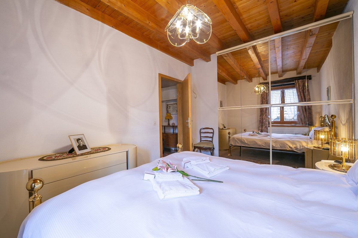 The 2-bedroom retreat is suitable for up to 3 guests and features a super spacious, cosy and characteristic living room for enjoying carefree moments of relaxation together; a flatscreen HDTV, ample seating space, exposed beam ceiling and an ambient fireplace complete the layout of the lounging area. A warm wooden dining area along with a fully-equipped kitchen with a coffee machine, oven, fridge and microwave further invites you to prepare delicious homemade meals and dine in the holiday house. The sleeping area is on the upper level and there is an extra WC in the living area for added convenience.