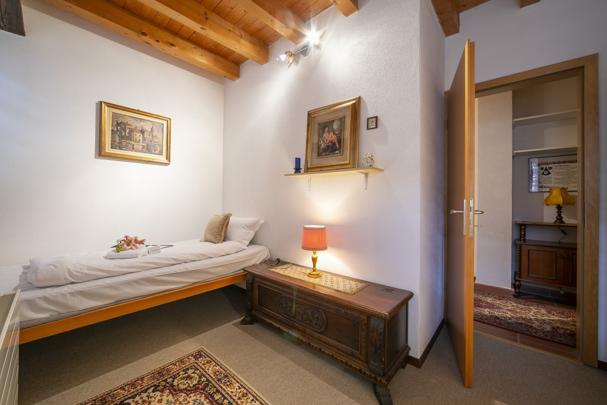 Bedroom 2: A cosy single bedroom with a wooden chest and wardrobe.