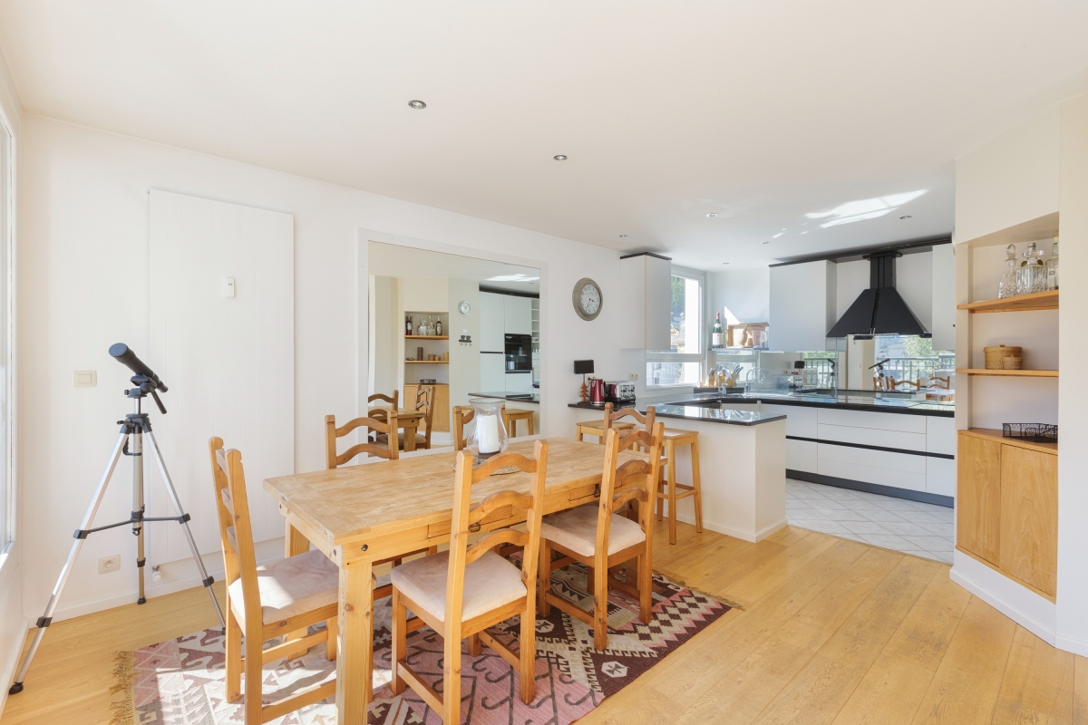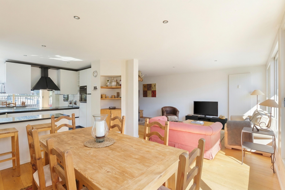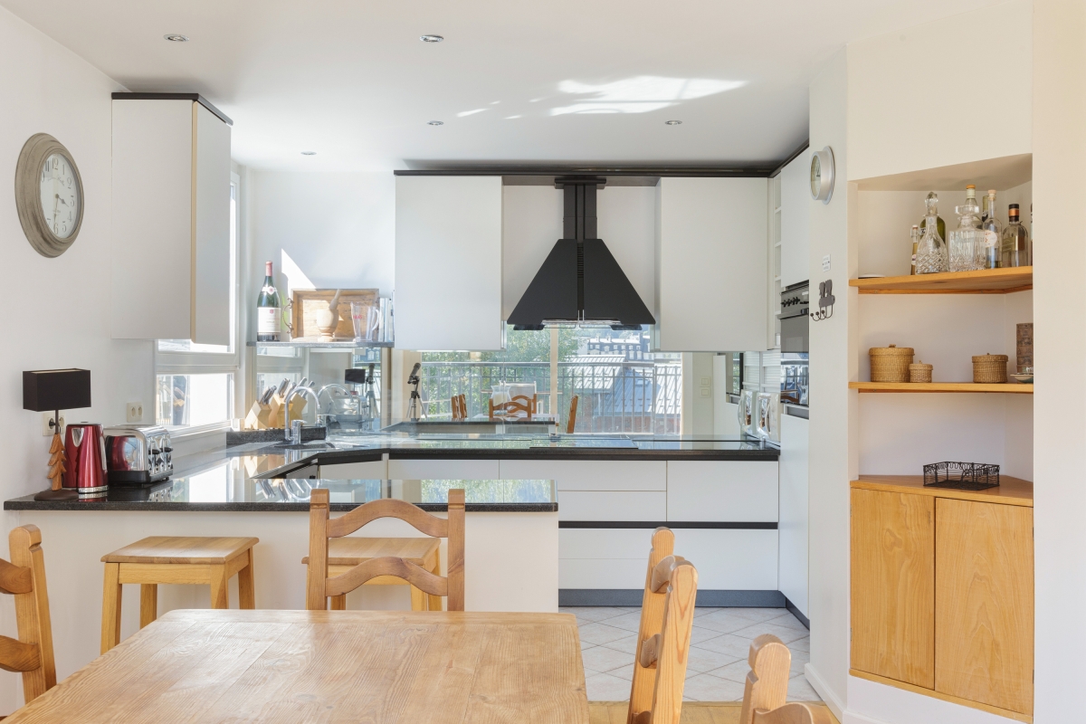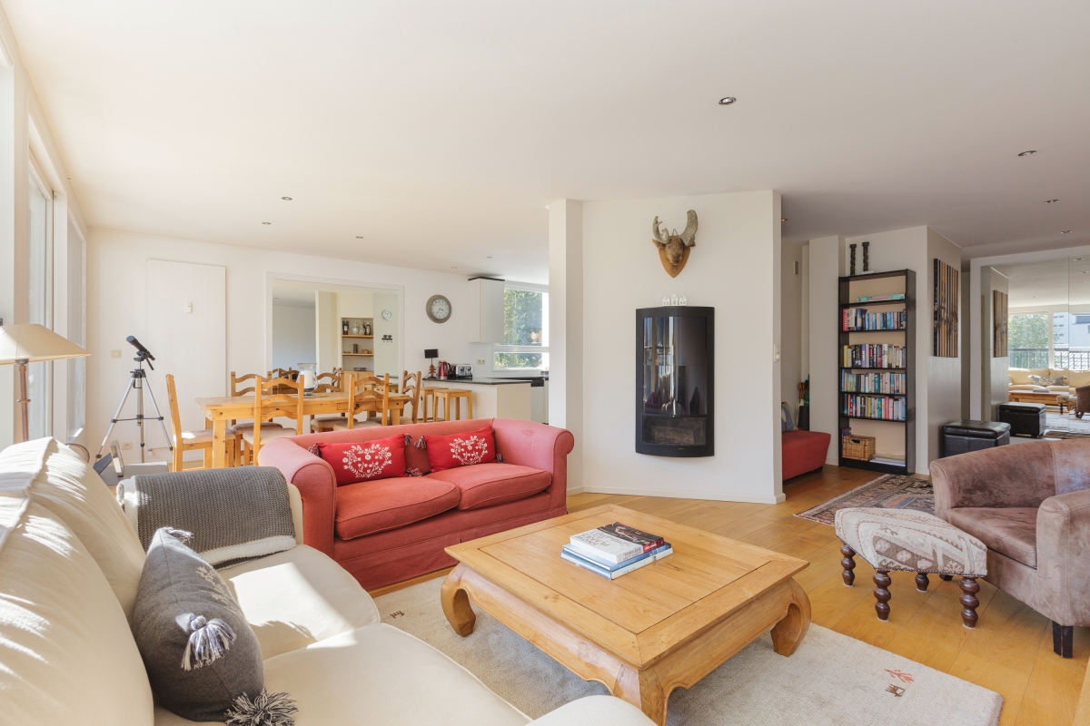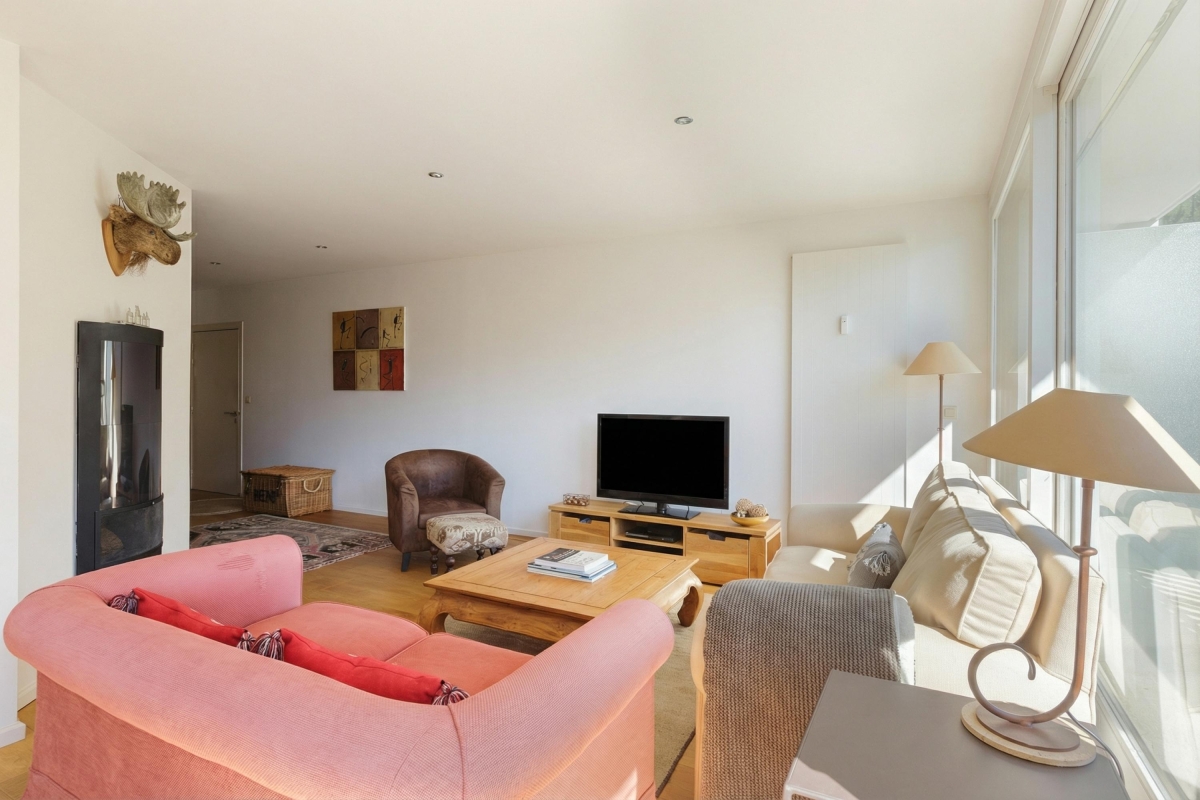 On the third floor of a modern residence, set in extensive gardens, this airy apartment sleeps 5 people in comfort. The large living area has a wide window along one wall, including a sliding door that leads out onto a balcony, with spectacular views. There is a table and chairs on the balcony, where guests can sit and relax. The contemporary, comfortable furniture in the living room includes 2 large sofas and a leather armchair, with a glass-fronted, wood-burning stove. The dining table, for 6 people, is set between the windows and an ultra-modern, extensive kitchen. The kitchen is separated from the living area by a wide breakfast bar and is well-equipped with a cooker hob, oven, microwave, dishwasher, fridge, american style coffee machine, extractor fan, raclette and fondue.