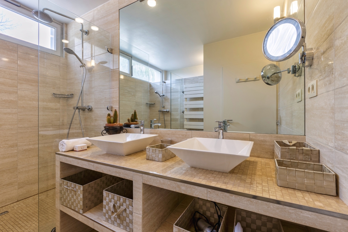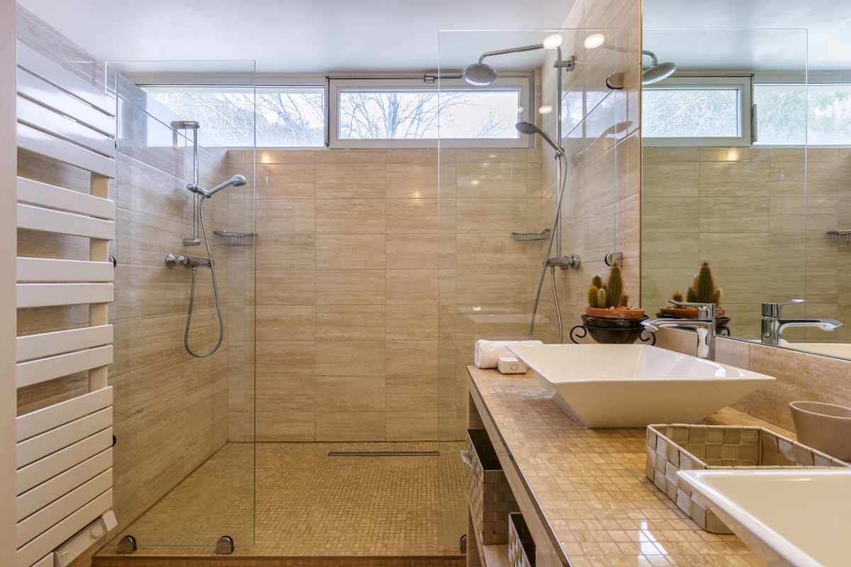 This independent bathroom includes a spacious, glass shower, with multiple showerheads, double basins and a WC.