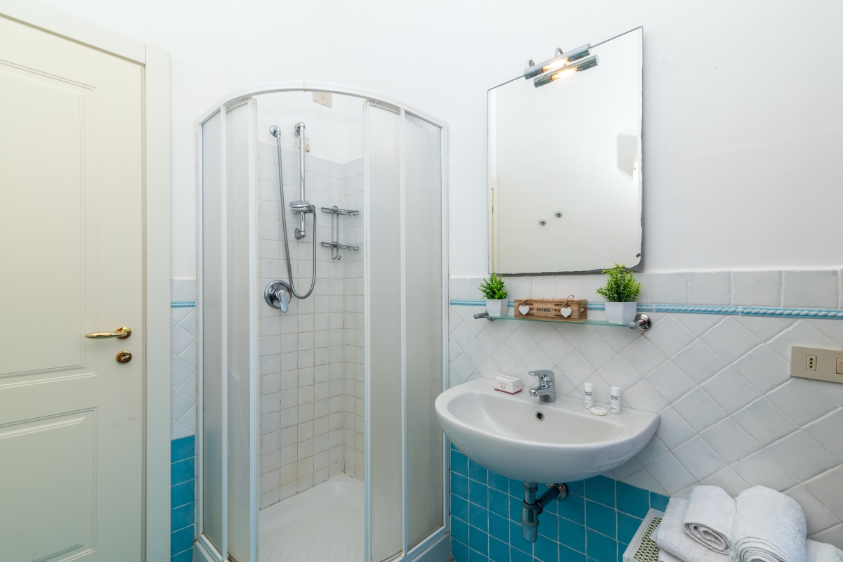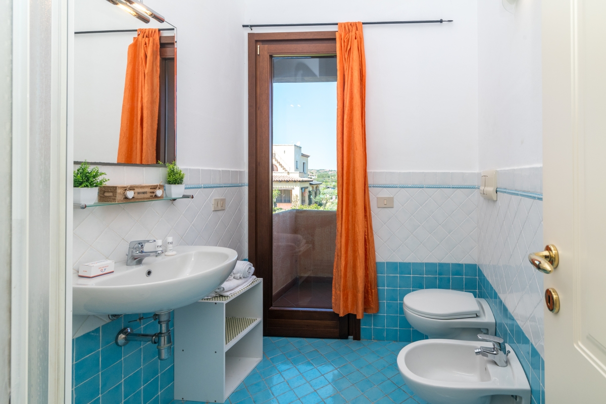 Bathroom: The attractively tiled bathroom has a shower, bidet, basin, and WC, plus a door out onto a private balcony