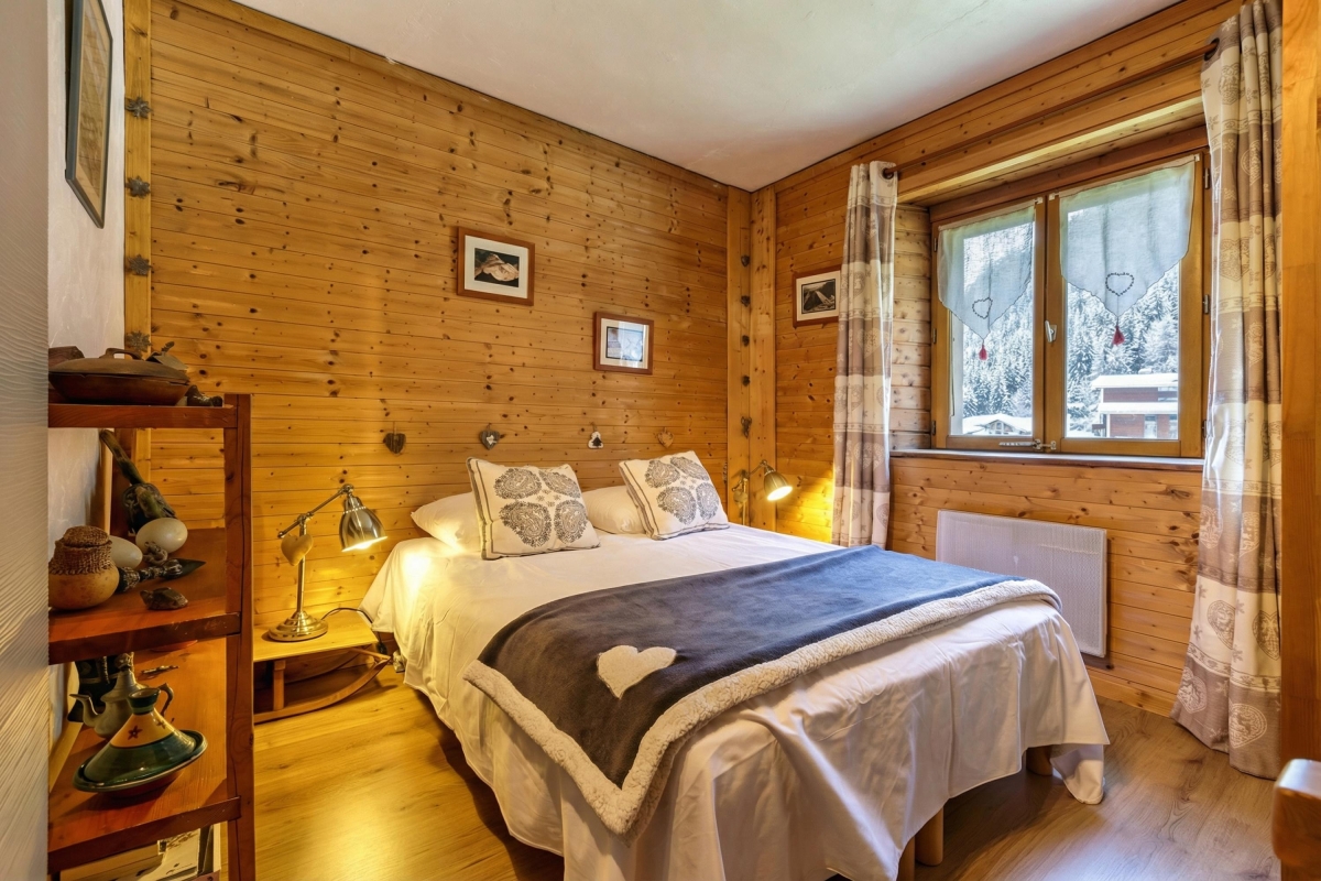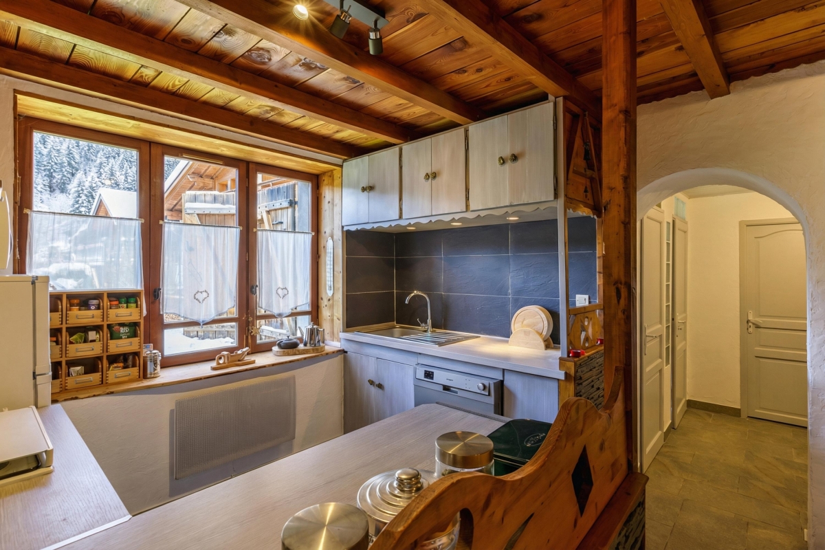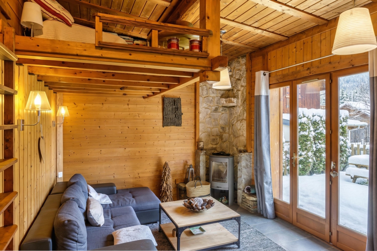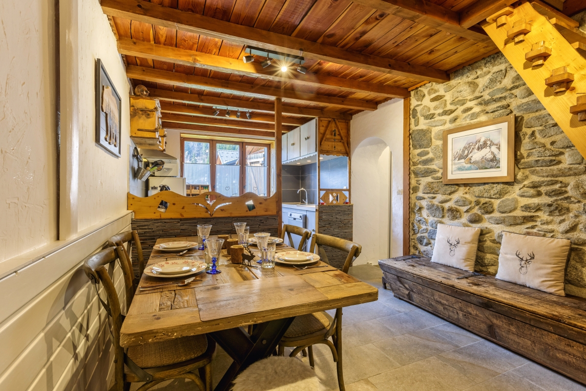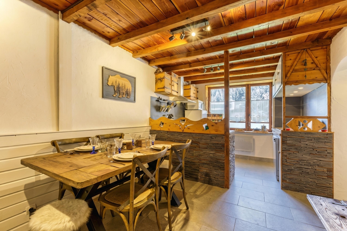 Set in its own private garden with stunning views towards Mont Blanc, the apartment sleeps 4 people in comfort and is the perfect holiday retreat all year round. The spacious living room is beautifully fitted out with slate floors, stone and wooden walls and a large double glass door leading directly onto the garden. The garden has a wooden table with benches for relaxed outdoor dining. Back inside the sitting room has a large stylish sofa, wooden writing desk, coffee table and a corner wood-burning stove.