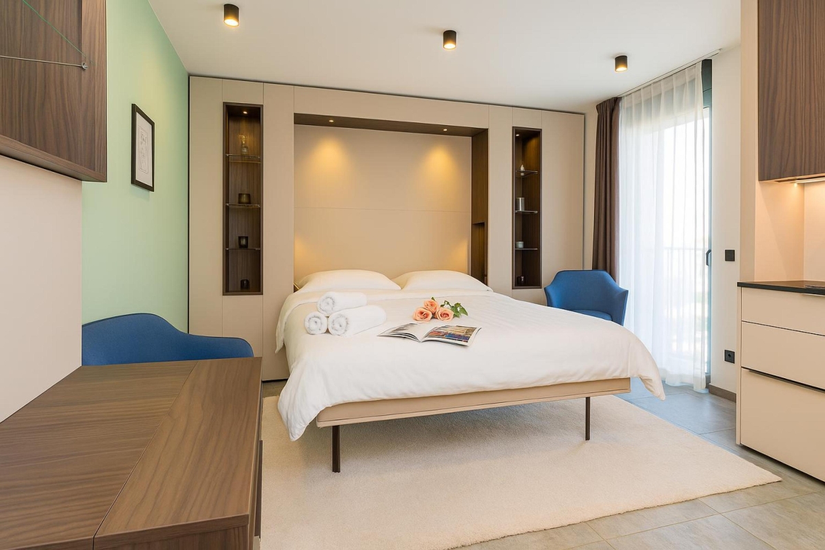 This luxurious new development welcomes people coming to Lugano for business and those who are looking for a relaxing city break. The residence has excellent communal facilities including co-working space, a restaurant and bar on the ground floor with extensive outdoor seating, a gym and storage space.