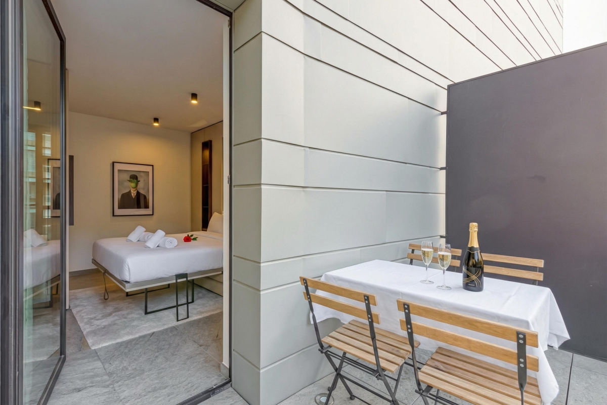 The bright studio apartment sleeps 2 people. The living room has a glass door that leads out onto a private terrace with a wooden table and two chairs. The living area has a contemporary sofa, a flat screen Smart TV and dining table with 2 seats. In the sleek, open plan kitchen you will find everything you might need during your stay: a cooker hob, microwave, fridge, freezer and Nespresso machine.