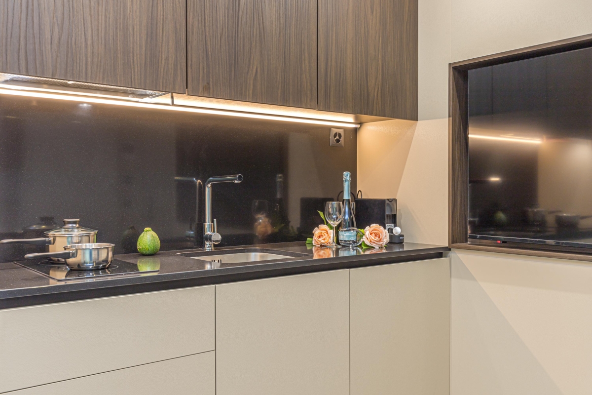 The bright apartment sleeps 2 people. The stone-floored living area has a contemporary sofa, a flat-screen Smart TV and a dining table with 2 seats. In the open plan kitchen, you will find everything you might need during your stay: a cooker hob, microwave, fridge, freezer and Nespresso machine. All fittings throughout the apartment are of the highest quality.