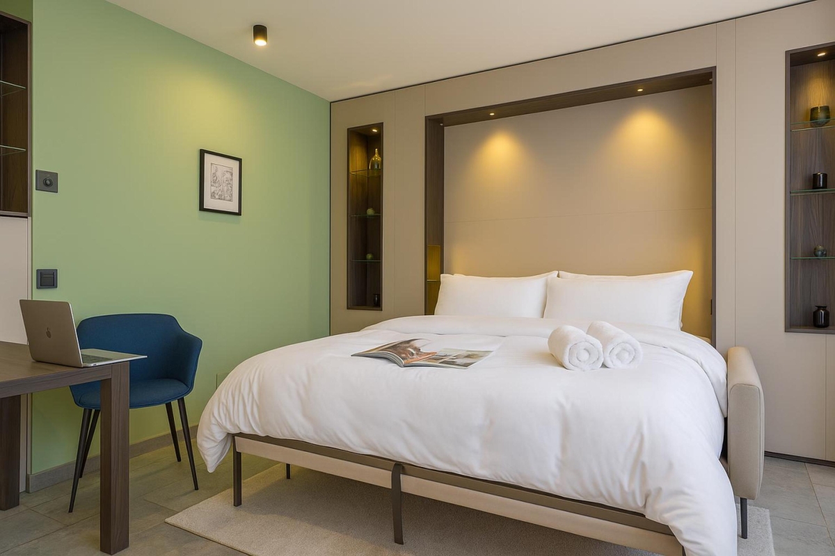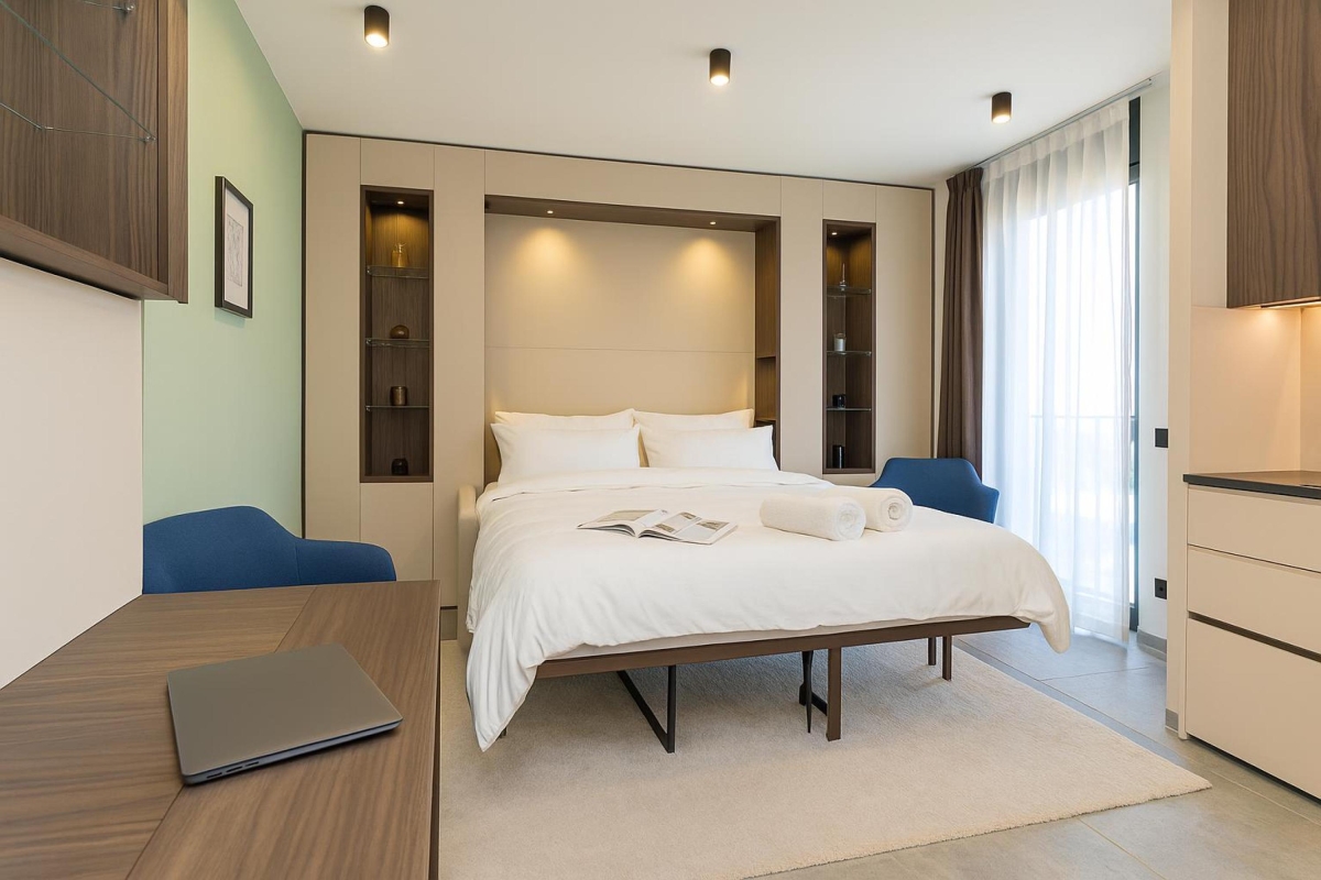 This luxurious development caters to people coming to Lugano for business, and those who are looking for a relaxing city break. The communal facilities include co-working space, reception rooms, a ground floor bar and restaurant with outdoor seating, a gym and secure storage space.