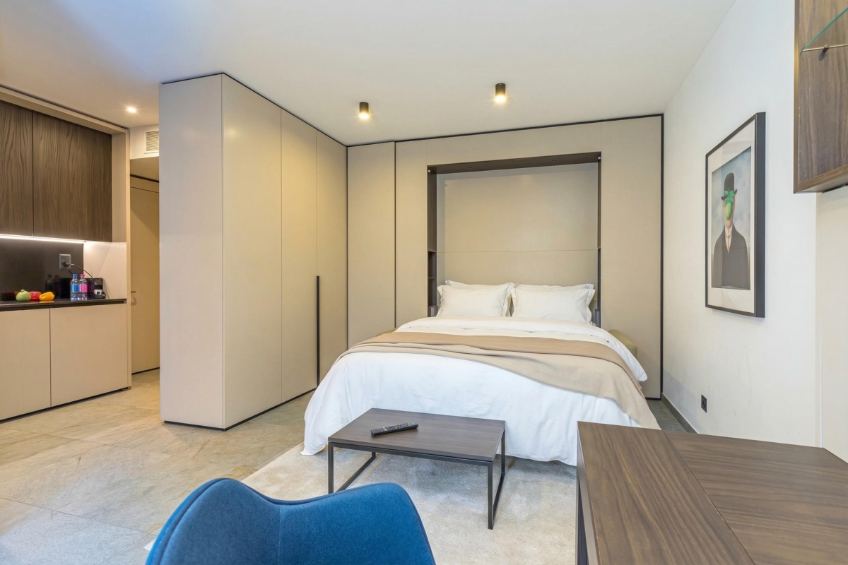 The bright studio apartment sleeps 2 people in comfort. The sunny living area has a contemporary sofa, coffee table, a flat-screen Smart TV and dining table with 2 seats. In the ultra-modern, open plan kitchen you will find everything you might need during your stay: a cooker hob, microwave, fridge, freezer and Nespresso machine.