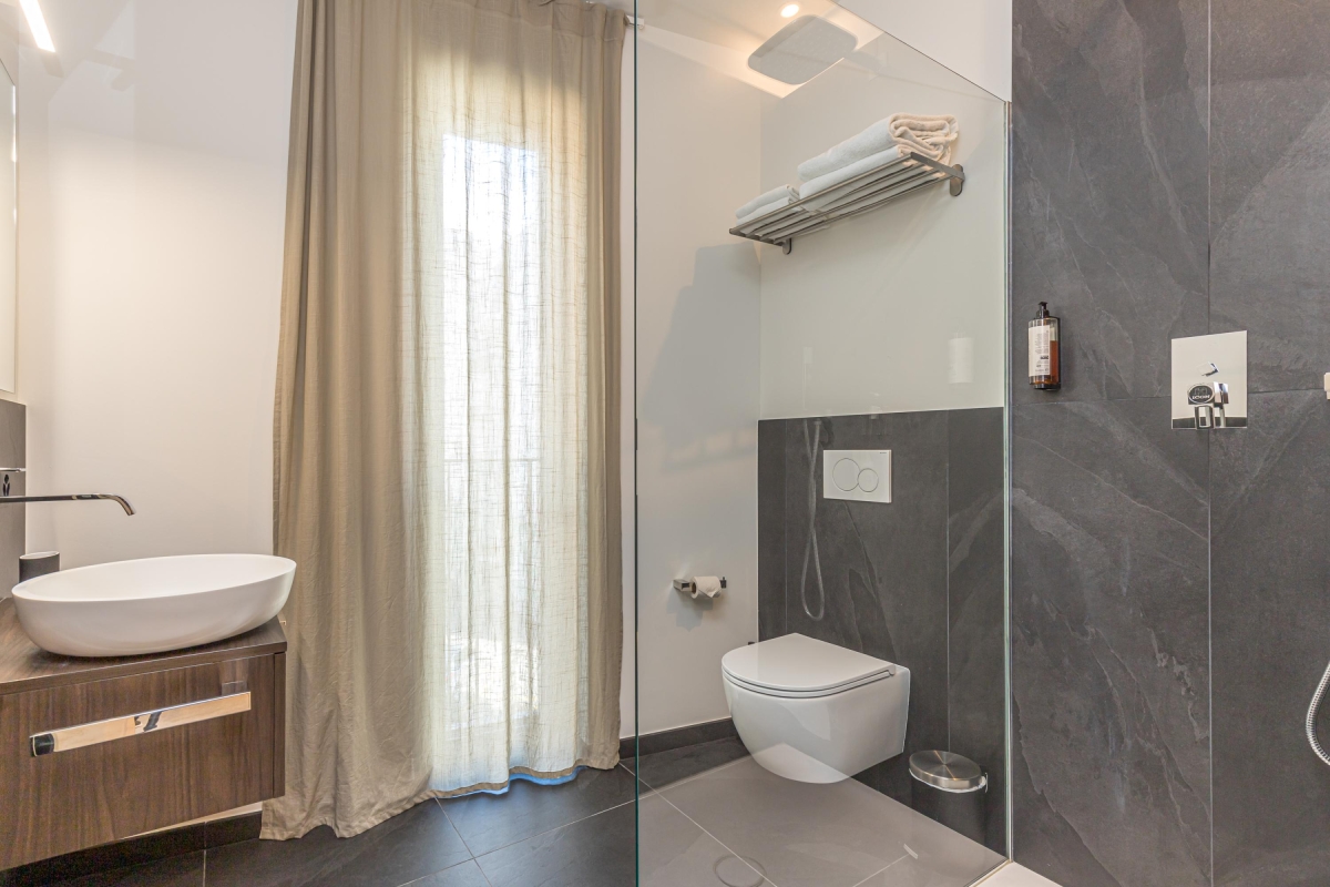The stylish stone-tiled bathroom has a glass shower, large basin and WC.
