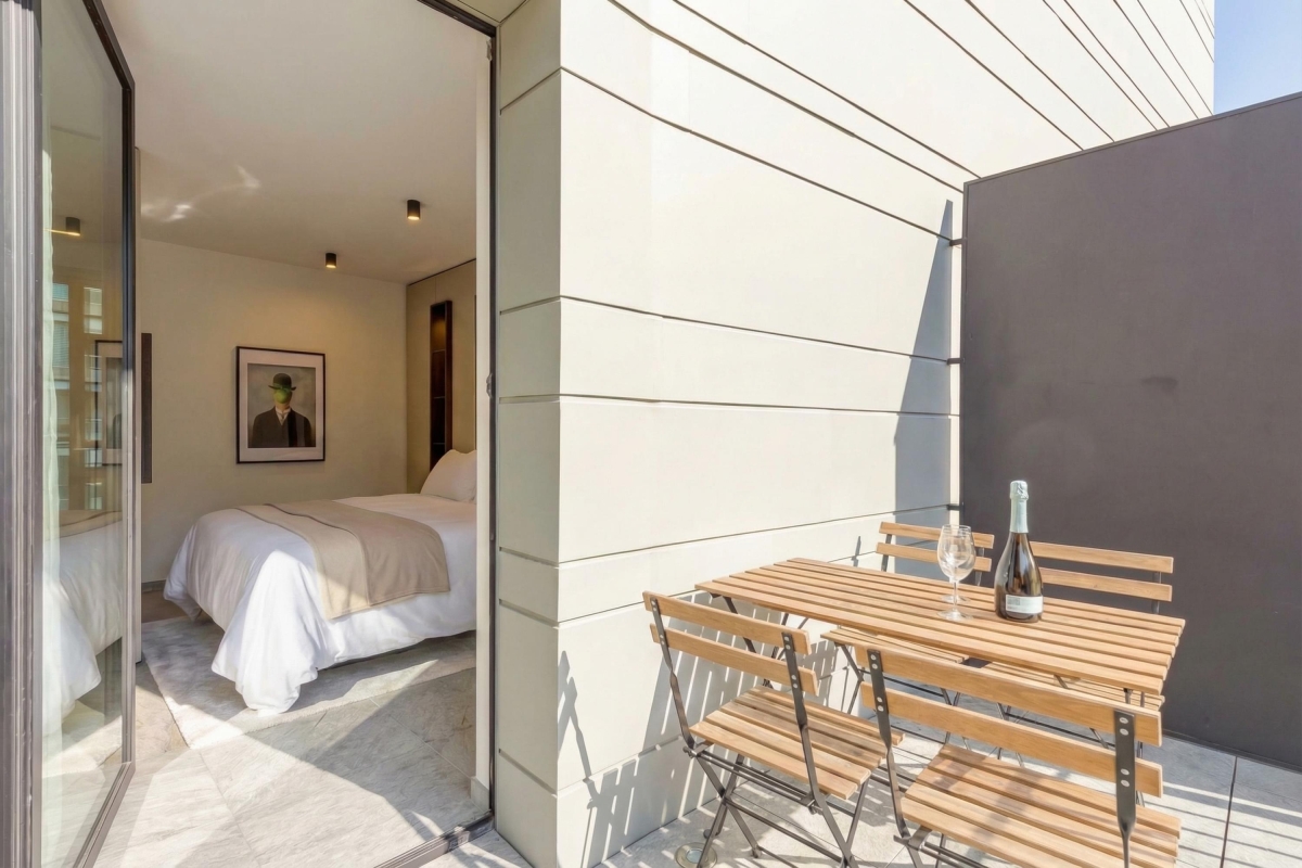 The bright studio apartment, on the 3rd floor, sleeps 2 people. The living room has a glass door that leads out onto a private balcony with a table and two chairs, so you can dine al fresco. Inside, the stone-floored living area has a contemporary sofa, coffee table, a flat-screen Smart TV and a dining table with 2 seats. In the modern, open plan kitchen you will find everything you might need during your stay: a cooker hob, microwave, fridge, freezer and Nespresso machine.