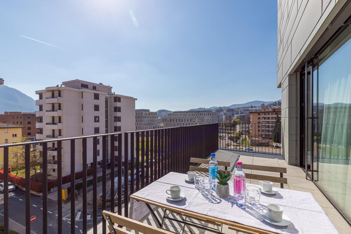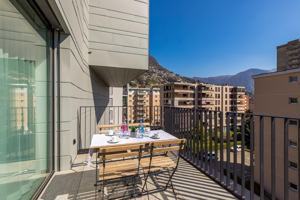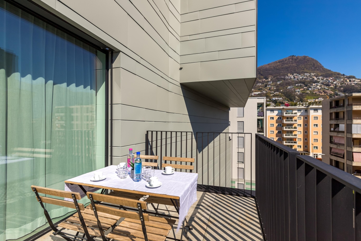 On the fourth floor of an exclusive block, this apartment can sleep up to 4 people. The sunny living room has a large glass door that leads out onto a private balcony with views out over Lugano, a wooden table and four chairs for dining al fresco. Back inside, the spacious living area has a comfortable sofa, a flat screen Smart TV and dining table with 4 seats. In the minimalist, open plan kitchen you will find everything you might need during your stay: a cooker hob, oven, dishwasher, fridge, freezer and Nespresso machine.