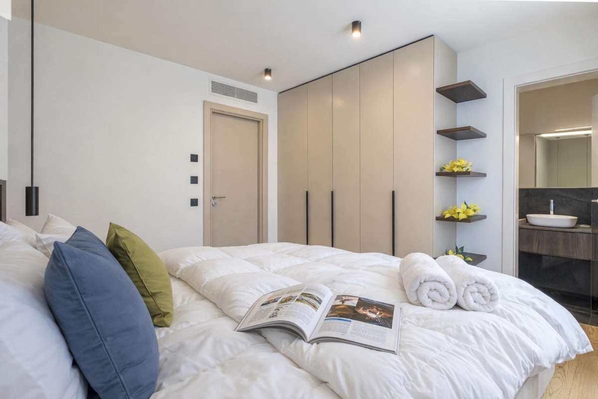 The sunny living room has a large glass door that leads out onto a private balcony with a wooden table and four chairs, so guests can dine al fresco and enjoy stunning views over the city and distant mountains. The stone-floored living area has a contemporary sofa, a flat-screen Smart TV and a dining table with 4 seats. In the stylish, open-plan kitchen you will find everything you might need during your stay: a cooker hob, oven, microwave, fridge, freezer, dishwasher and Nespresso machine.