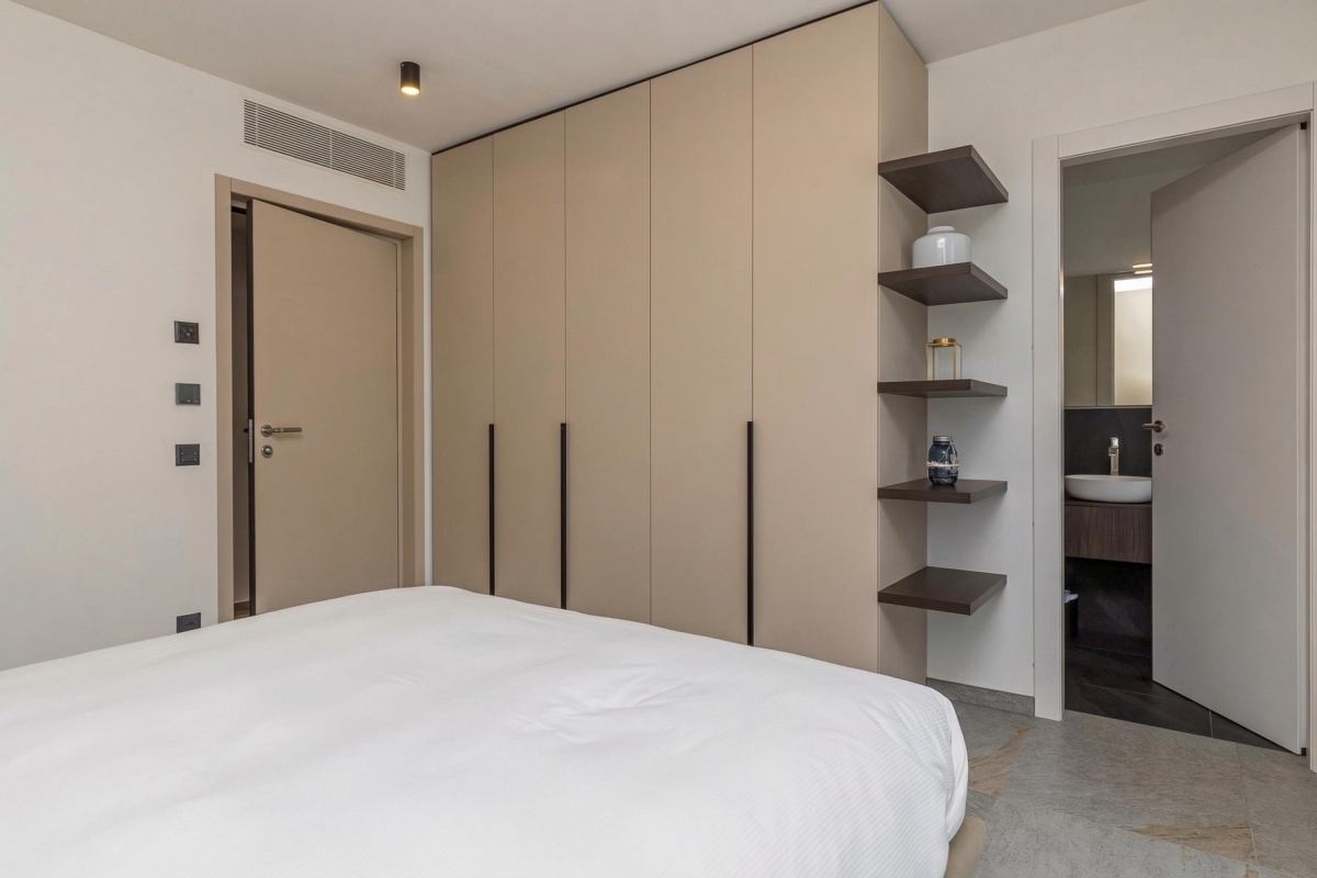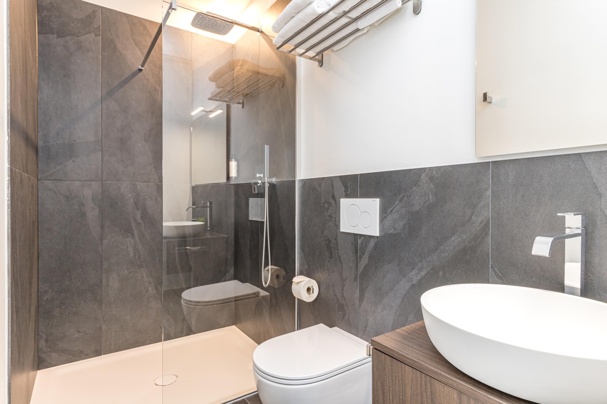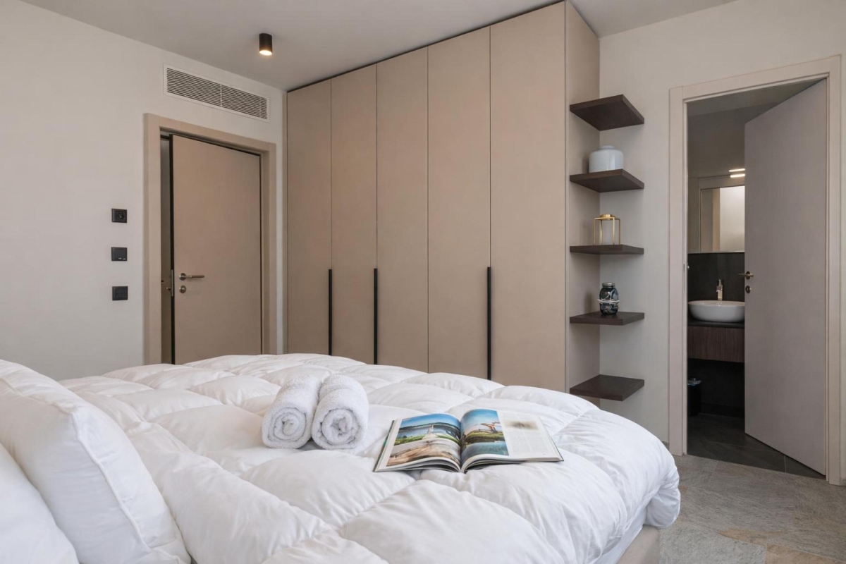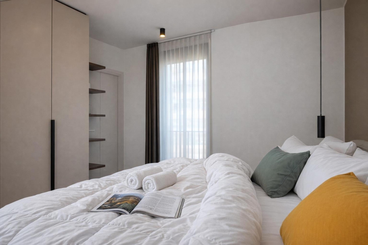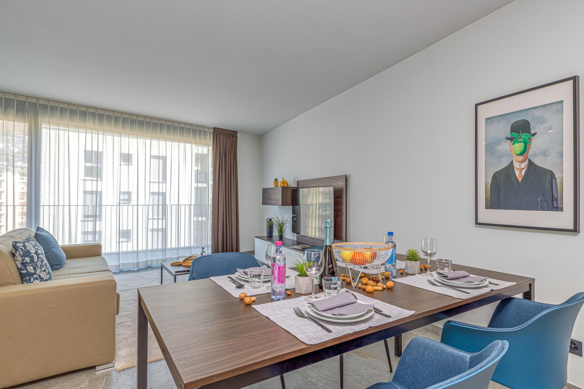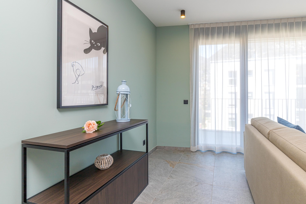 A light-filled apartment that sleeps 4 people with elegant, contemporary décor. The living room has a wide glass door that leads out onto a private balcony with a wooden table and four chairs, so you can dine al fresco, with spectacular mounting views. The spacious living area has a large sofa, a flat screen Smart TV and dining table with 4 seats. In the modern, open plan kitchen you will find everything you might need during your stay: an induction hob, oven, dishwasher, fridge, freezer and Nespresso machine.