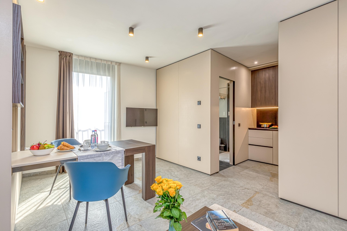 The bright studio apartment sleeps 2 people. The stone-floored living area has a contemporary sofa, coffee table, a flat-screen Smart TV and a dining table with 2 seats. The dining table can also be used as a workstation for business travellers. In the neat, open plan kitchen you will find everything you might need during your stay: a cooker hob, microwave, fridge, freezer and Nespresso machine. All fittings throughout the apartment are of the highest quality.