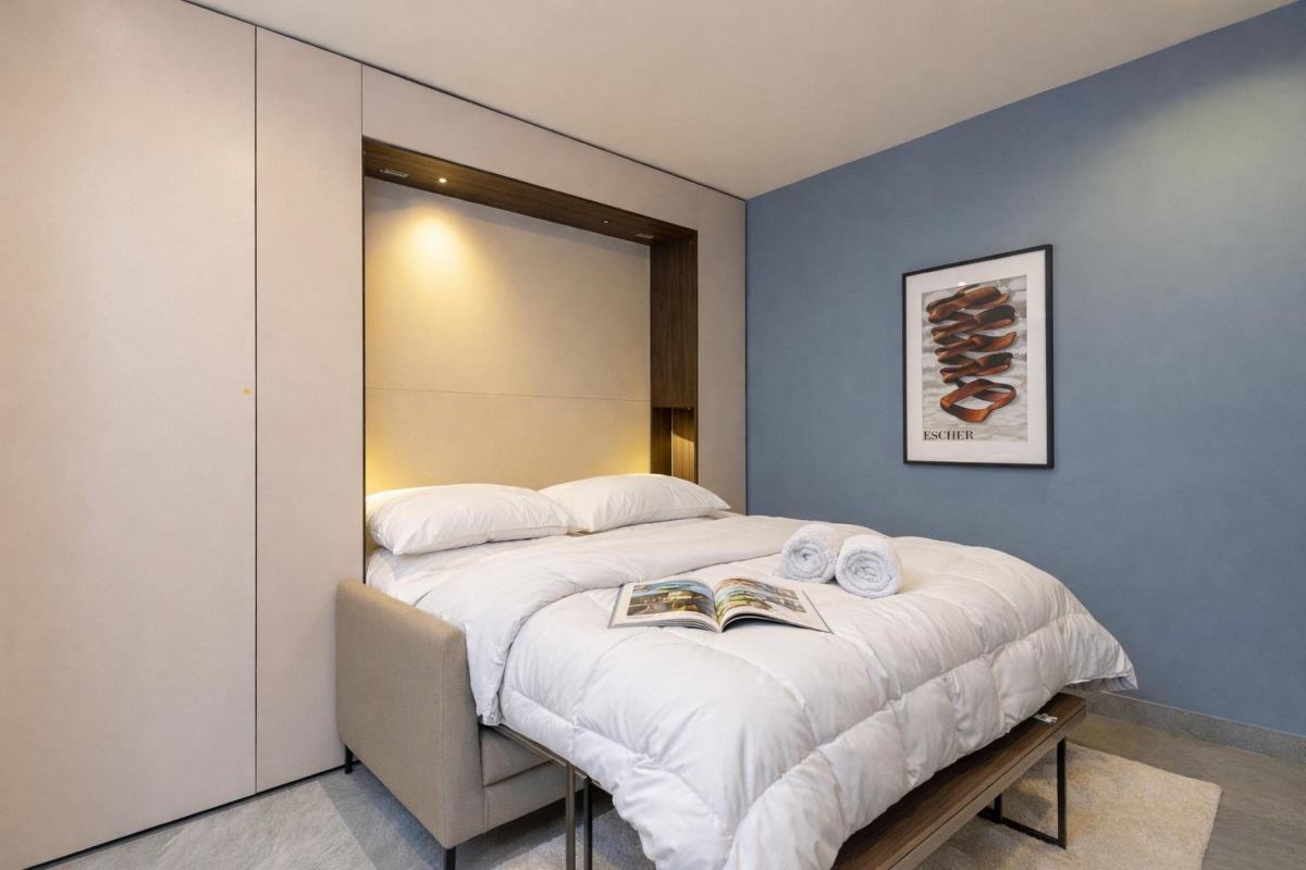 A contemporary studio apartment on the fourth floor of one of Lugano’s most luxurious new developments.