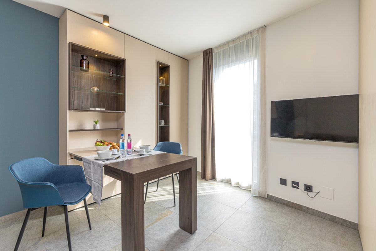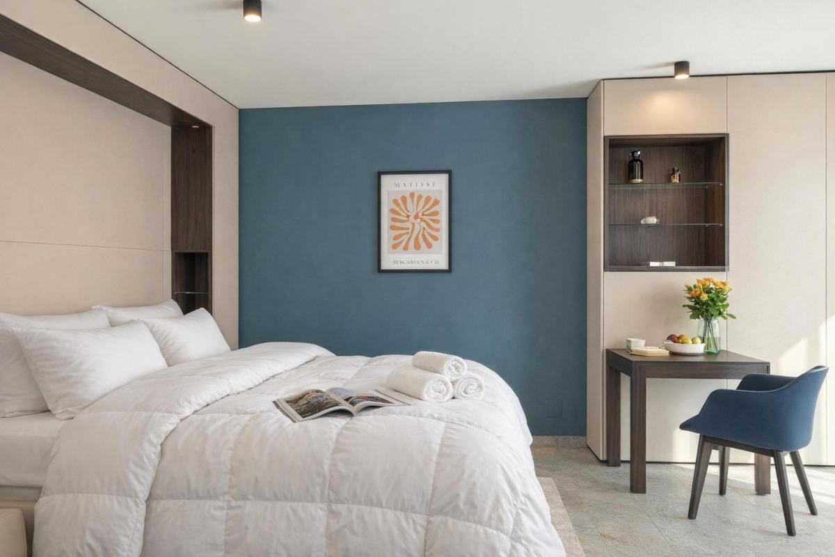 This luxurious development caters to people coming to Lugano for business and pleasure. The communal facilities include co-working space, reception areas, a ground-floor restaurant and bar with outdoor seating, a gym and secure storage space.