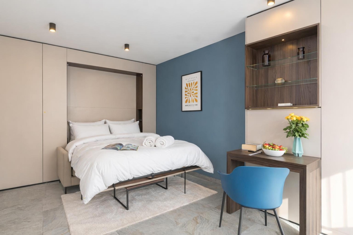 The elegant apartment sleeps 2 people. The spacious living room has stone flooring throughout. There is a contemporary sofa, coffee table, a flat-screen Smart TV and dining table with 2 seats. The dining table doubles up as a workstation for guests travelling for business. The neat, open plan kitchen is well-equipped with a cooker hob, microwave, fridge, freezer and Nespresso machine.