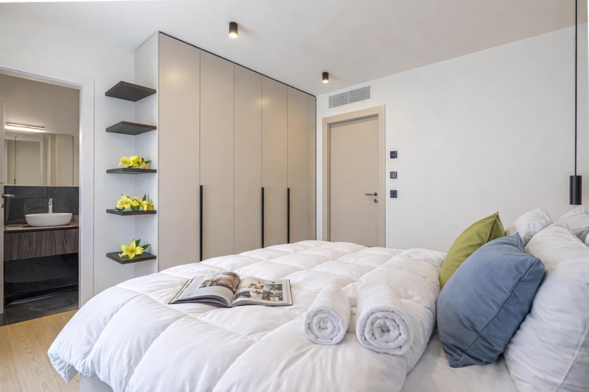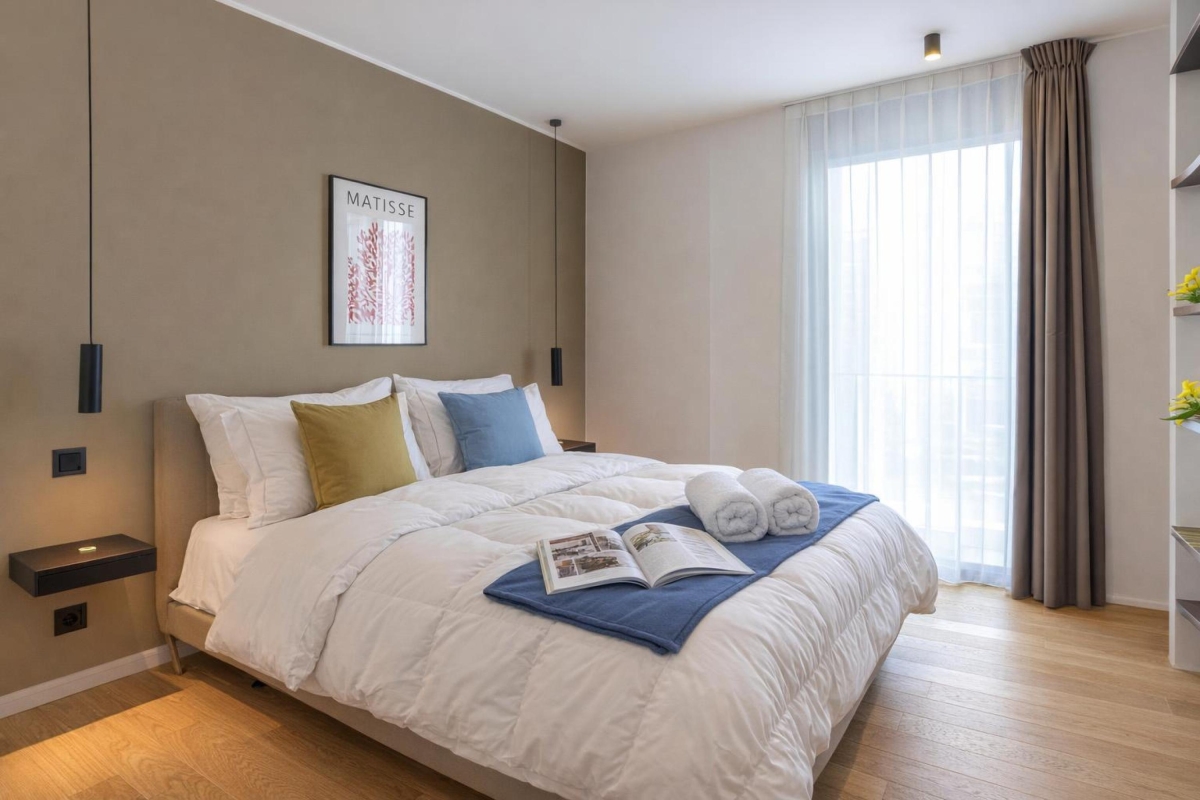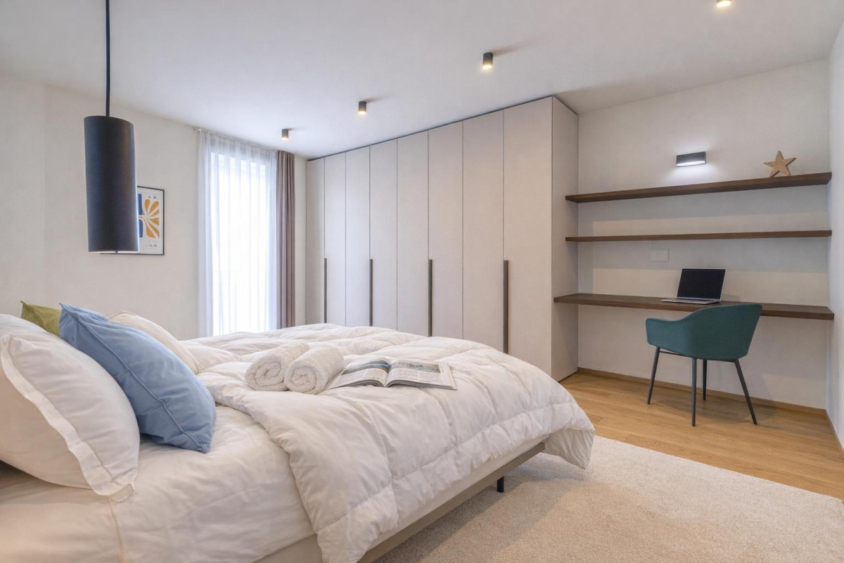 The apartment sleeps 6 people in comfort. The living room has a large glass door that leads out onto a private balcony with a wooden table and six chairs where you can dine al fresco and enjoy stunning views out across Lugano and the mountains. Back indoors, the open plan living area has a contemporary sofa, a flat-screen Smart TV and a dining table with 6 seats. In the sleek, fitted kitchen you will find everything you might need during your stay: a cooker hob, an oven, dishwasher, fridge, freezer and Nespresso machine. All fittings throughout the apartment are of the highest quality.