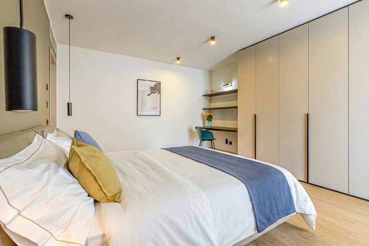 Bedroom 1: A spacious bedroom with a double bed, extensive wardrobes and a work station. There is also an en suite bathroom