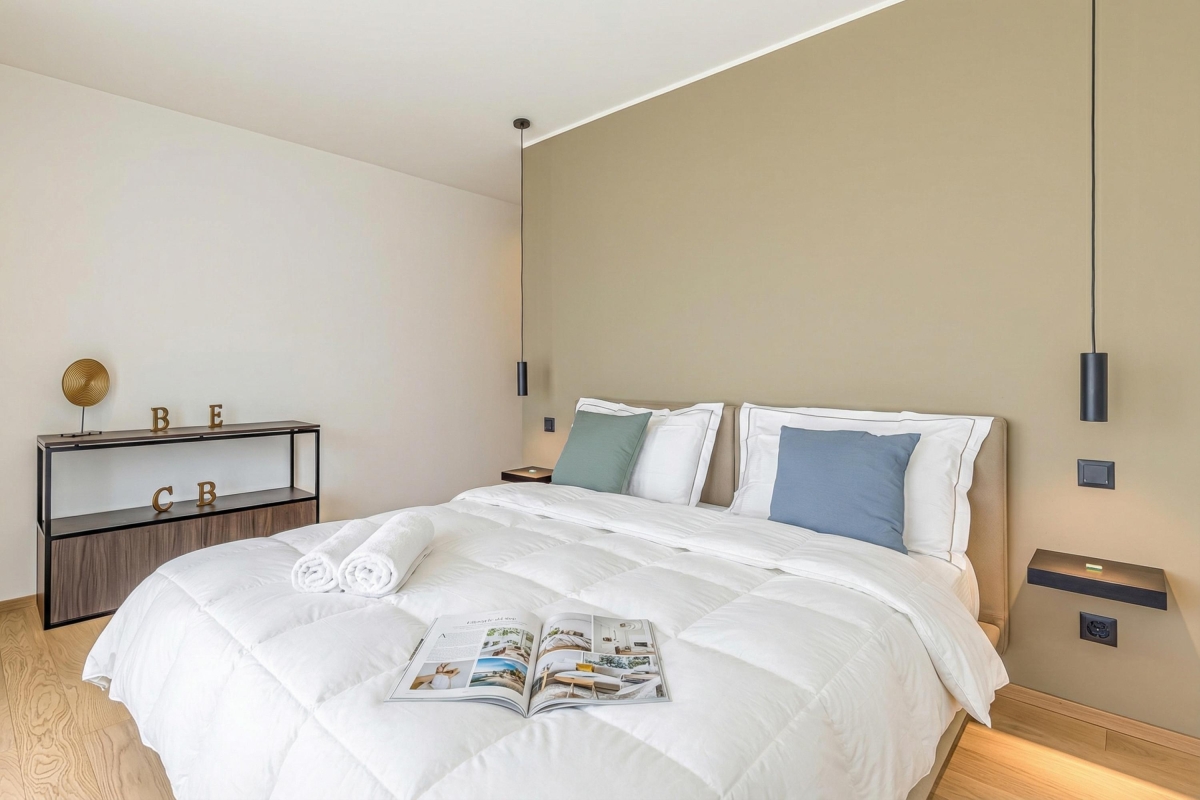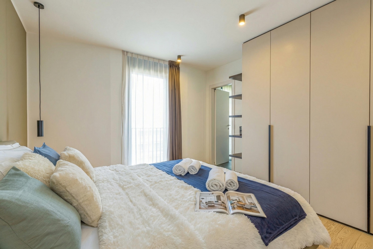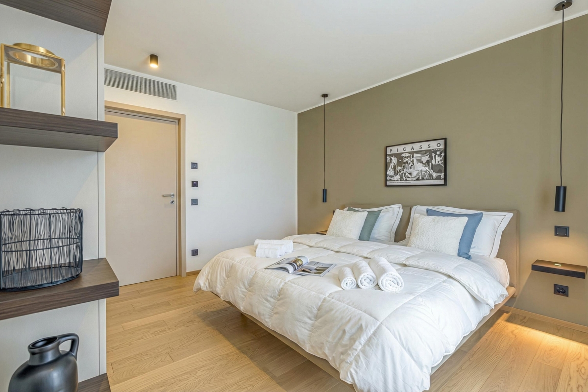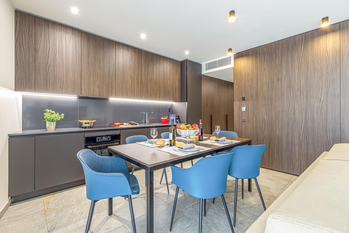 This light-filled apartment which sleeps up to 6 people, is elegant and spacious. The living room has a large glass door that leads out onto an extensive private balcony with a shaded area featuring a wooden table and four chairs for outdoor dining. Inside, the living area has a contemporary décor with wooden panels, a modern sofa, flat screen Smart TV and dining table with 6 seats. In the sleek, open plan kitchen you will find everything you might need during your stay: an induction hob, oven, dishwasher, fridge, freezer and Nespresso machine.
