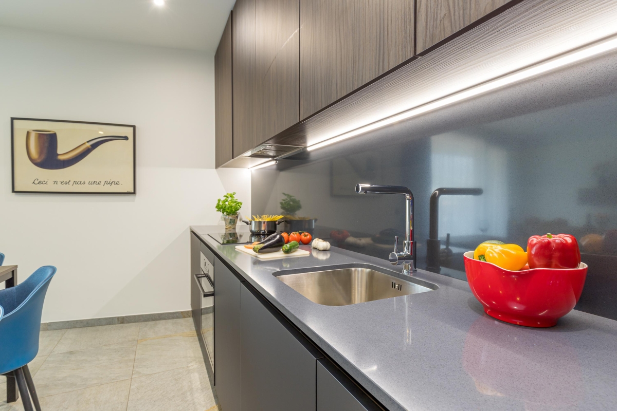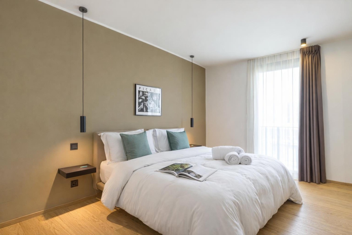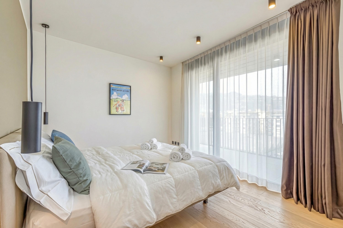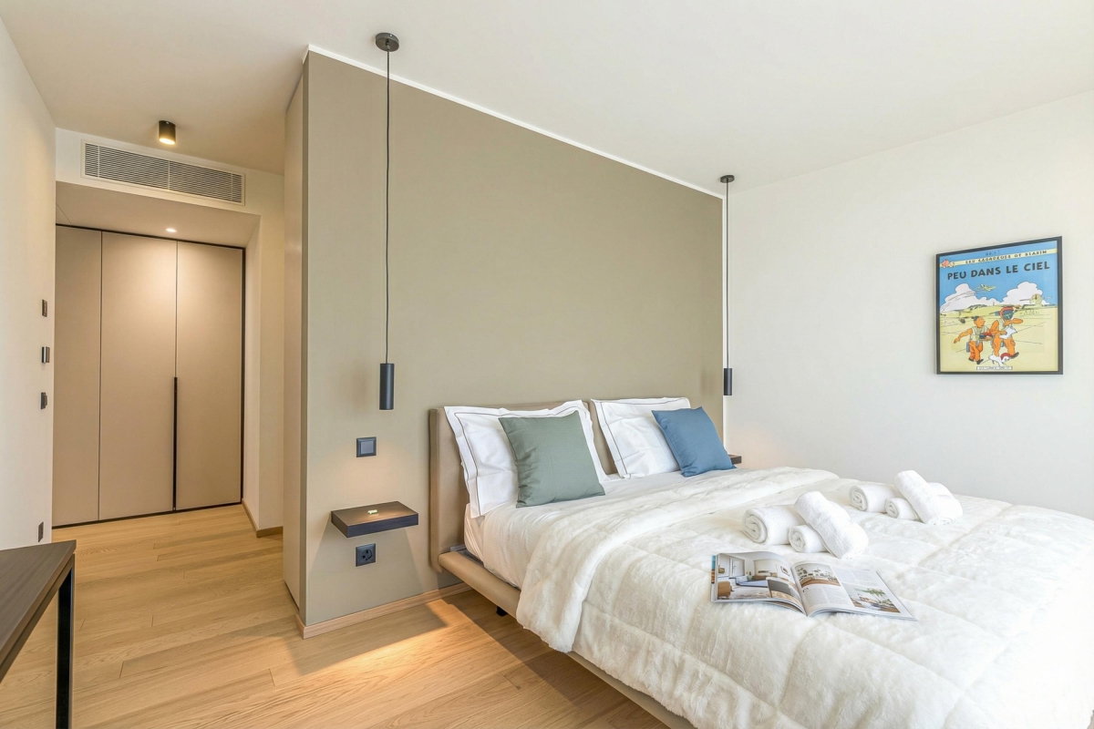 This light-filled apartment which sleeps up to 6 people, is elegant and spacious. The living room has a large glass door that leads out onto an extensive private balcony with a shaded area featuring a wooden table and four chairs for outdoor dining. Inside, the living area has a contemporary décor with wooden panels, a modern sofa, flat screen Smart TV and dining table with 6 seats. In the sleek, open plan kitchen you will find everything you might need during your stay: an induction hob, oven, dishwasher, fridge, freezer and Nespresso machine.