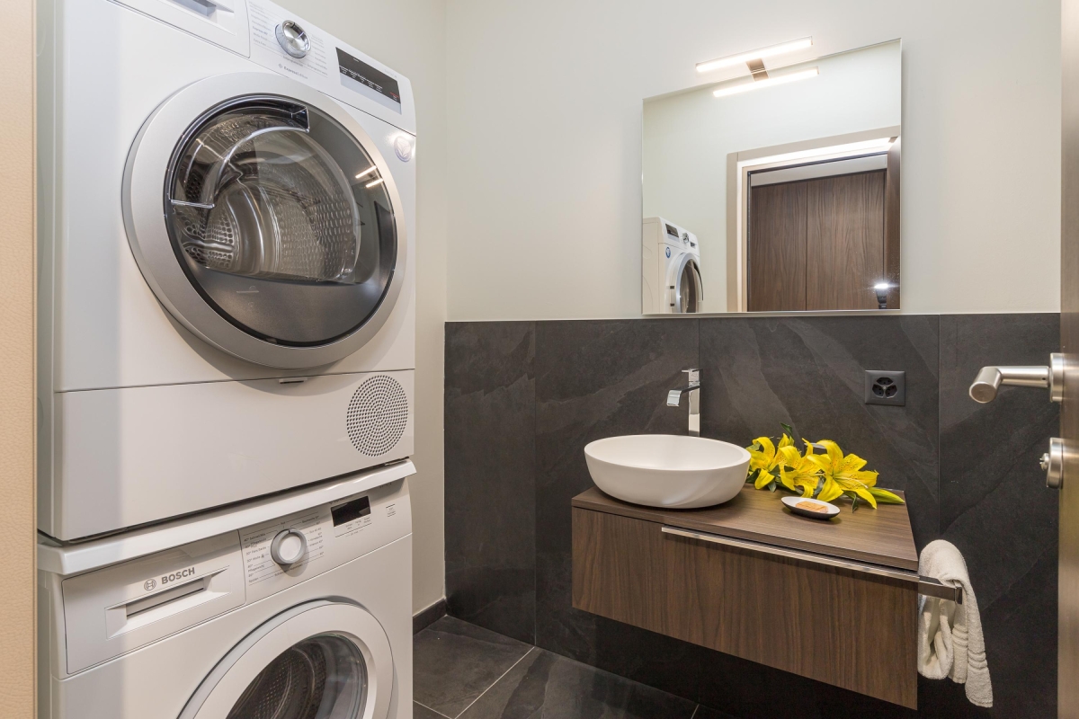 Bathroom 3: This bathroom contains a washing machine and dryer, a basin and WC.