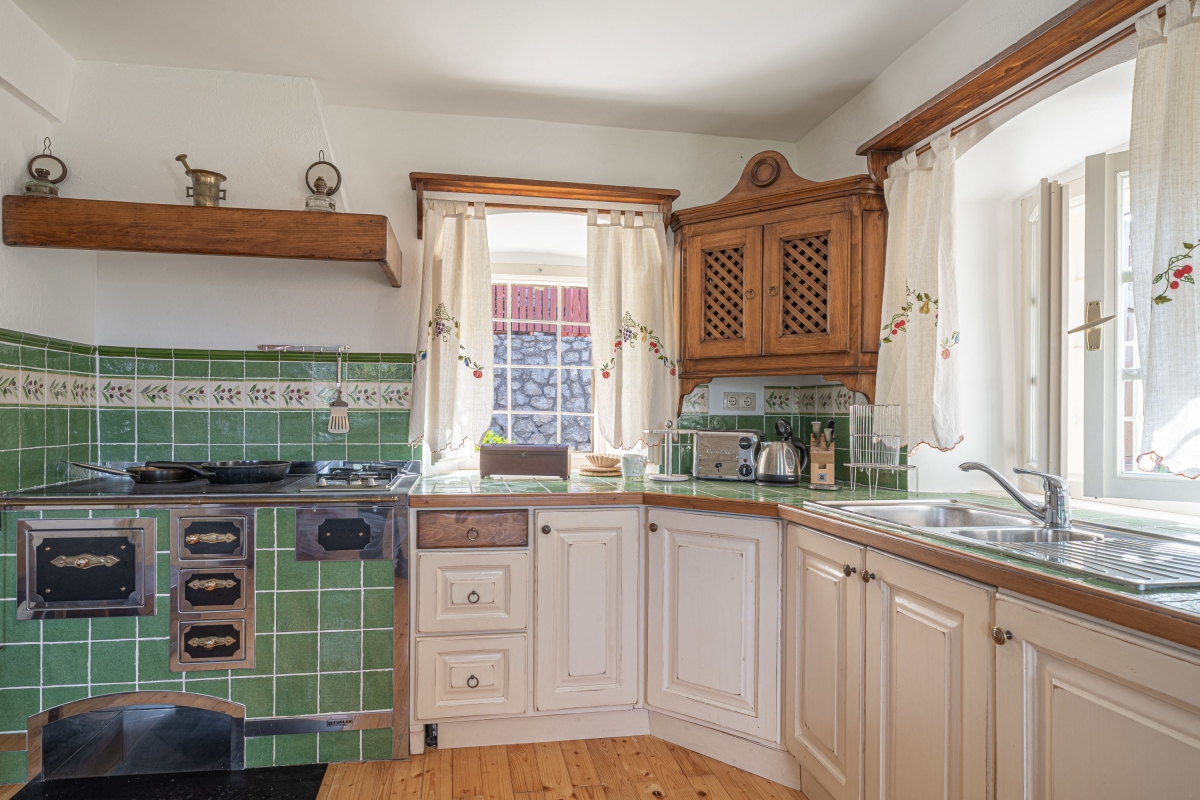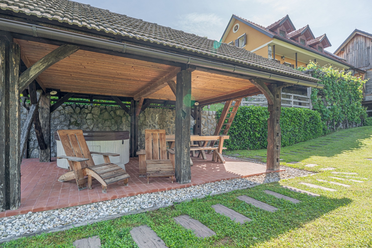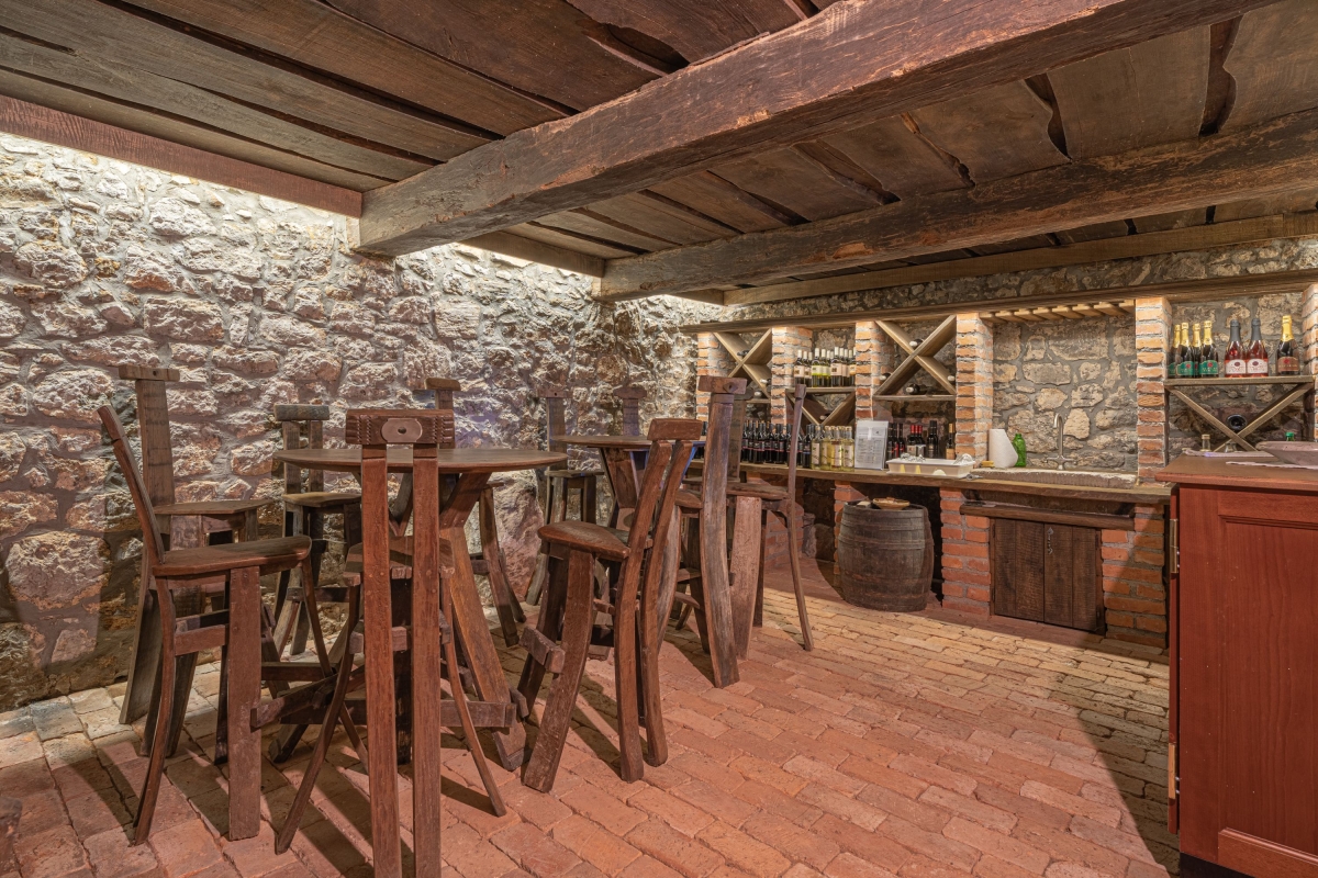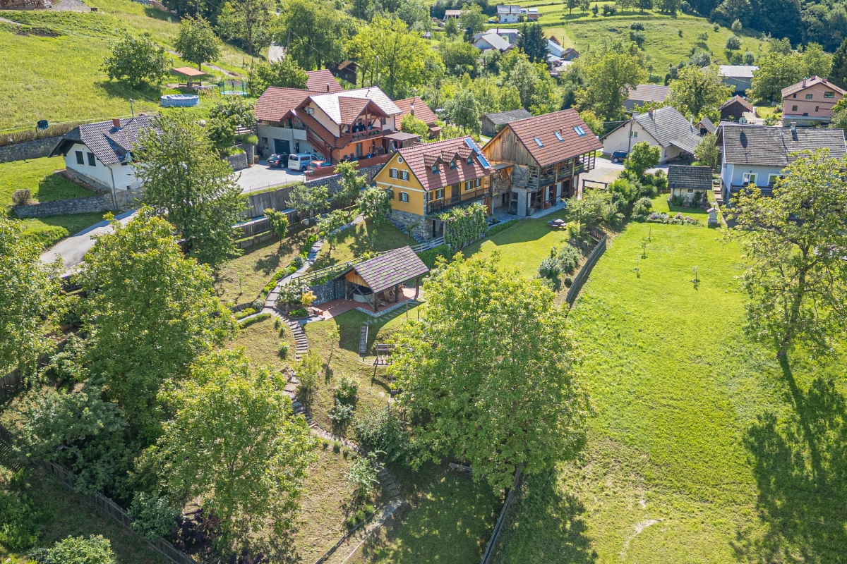 The house features a traditional village design typical of the Bela Krajina region. A separate barn houses a summer kitchen and a wine cellar, while the main home offers cozy interiors with restored antique furnishings, wood-burning fireplaces, and hand-embroidered linens. South-west facing, the home enjoys natural sunlight all day and opens to scenic garden and village views. Outdoors, you’ll find multiple terraces, a shaded arbor, a fenced garden, a playground, and an outdoor workout area.