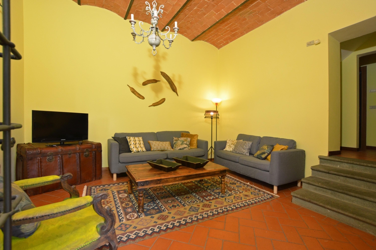 Traditionally built, with terracotta floors on the ground floor and vaulted brick ceilings, the house, which sleeps 4 people, has a spacious living room on the ground floor. The living room is decorated in a contemporary style with 2 large sofas and a flatscreen TV. French Windows lead from the living room out onto a corner loggia where guests can relax in several traditional Tuscan metalwork armchairs. Arches on the loggia open up onto the private garden, where there is a table and chairs for guests to dine al fresco.