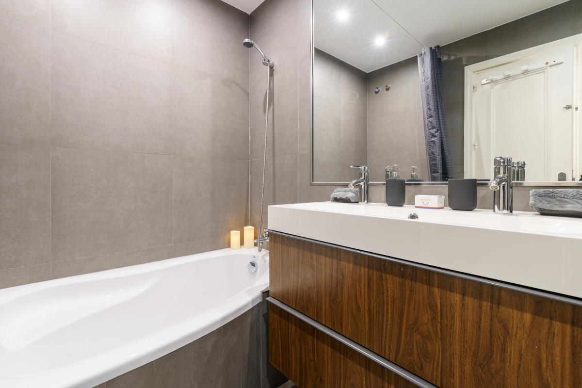 Bathroom 2: A contemporary fitted family suite with tub, overhead shower, wash basin & WC to share for 2 bedrooms.