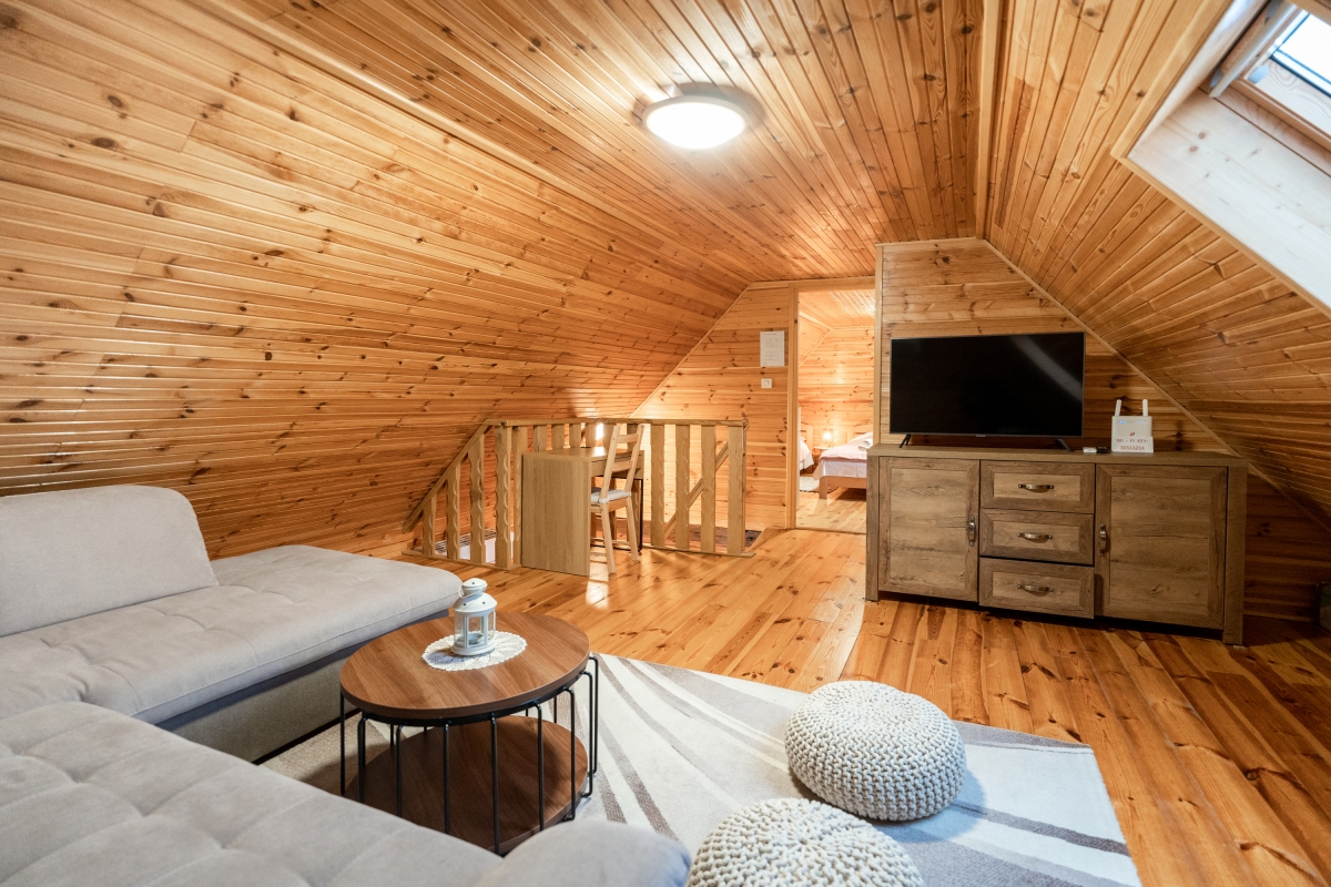 Open wooden stairs lead up to another sitting room with a large additional sofa, flatscreen TV and bedroom.