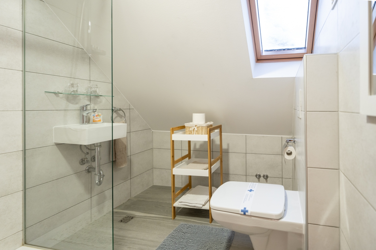 Bathroom 2: The first-floor bathroom has a glass shower, basin and WC.