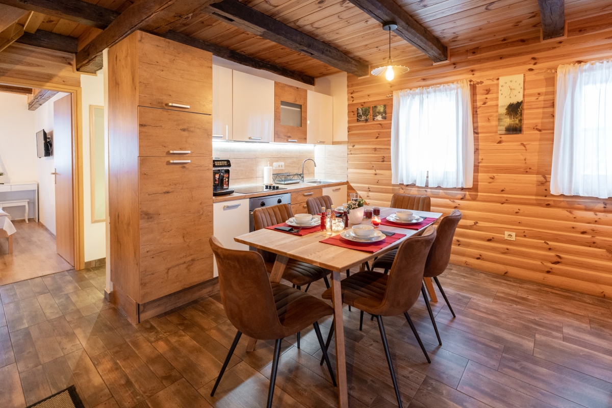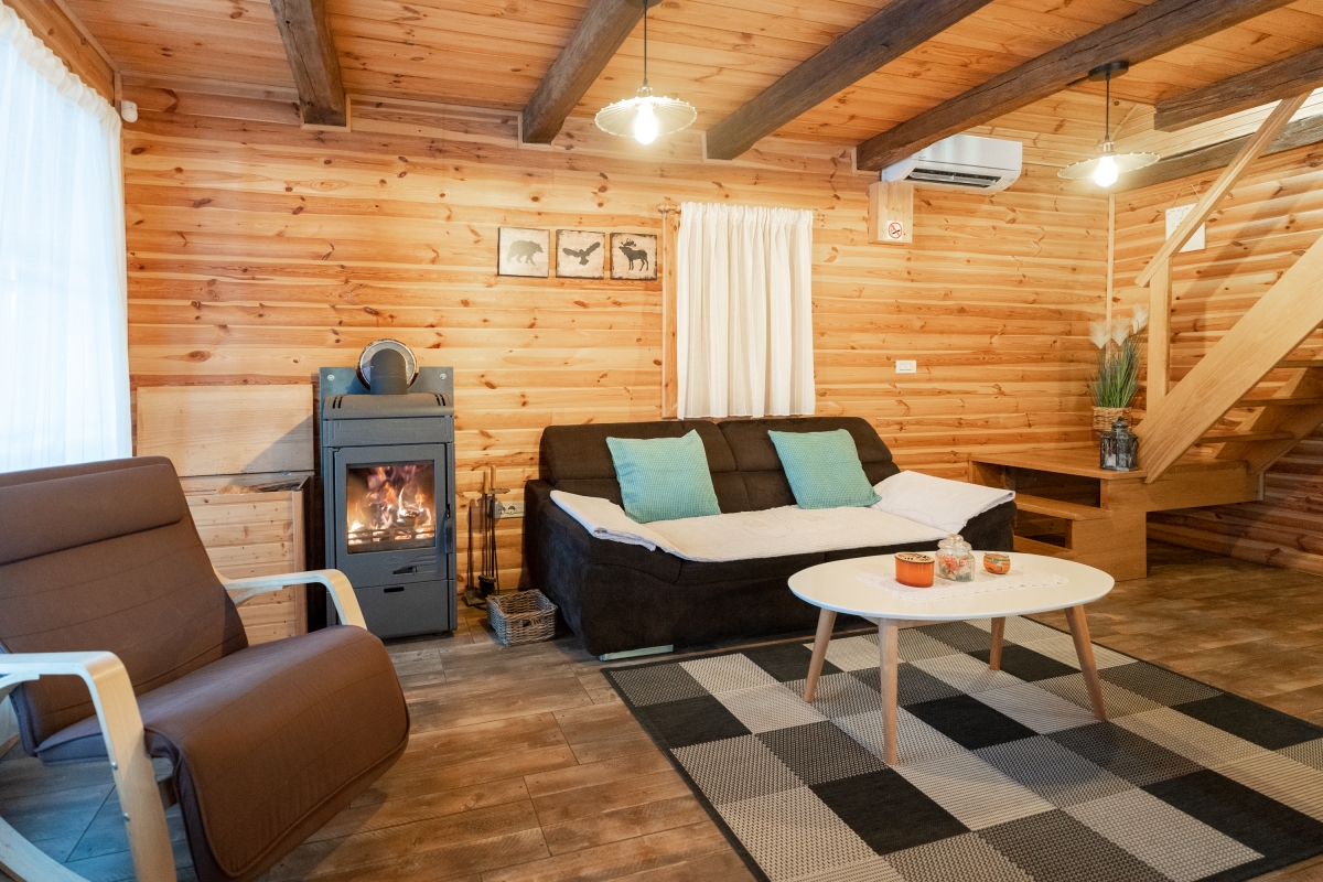 The house, which sleeps 6 people, is made almost entirely of oak, with wooden floors, walls and ceilings. On the ground floor, there is a spacious living area with a sofa, armchair, flatscreen TV, a wood-burning stove and French windows out onto the front terrace. The dining table seats 6 people and is next to the open-plan kitchen. The kitchen is well-equipped with an induction hob, oven, coffee machine, fridge/freezer and kettle.