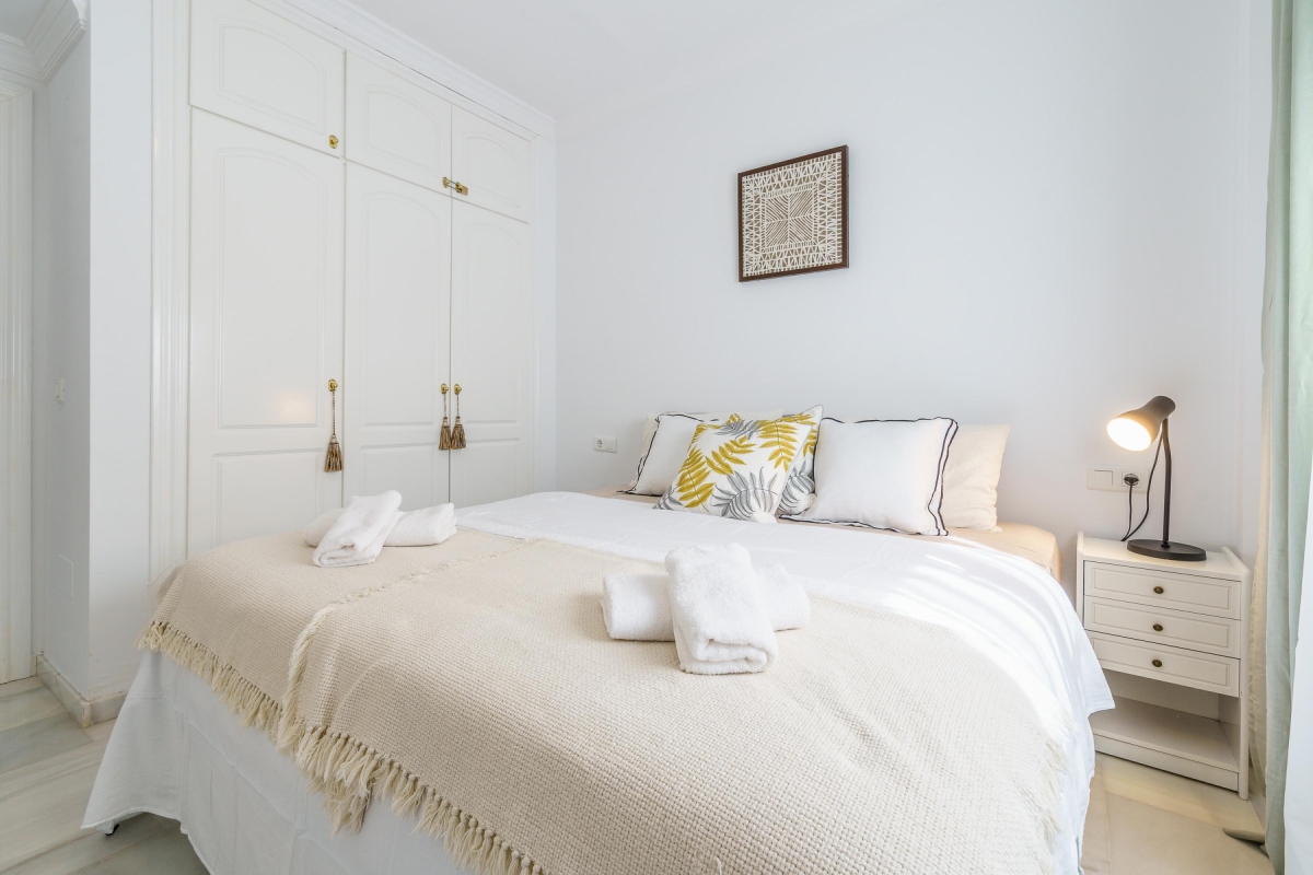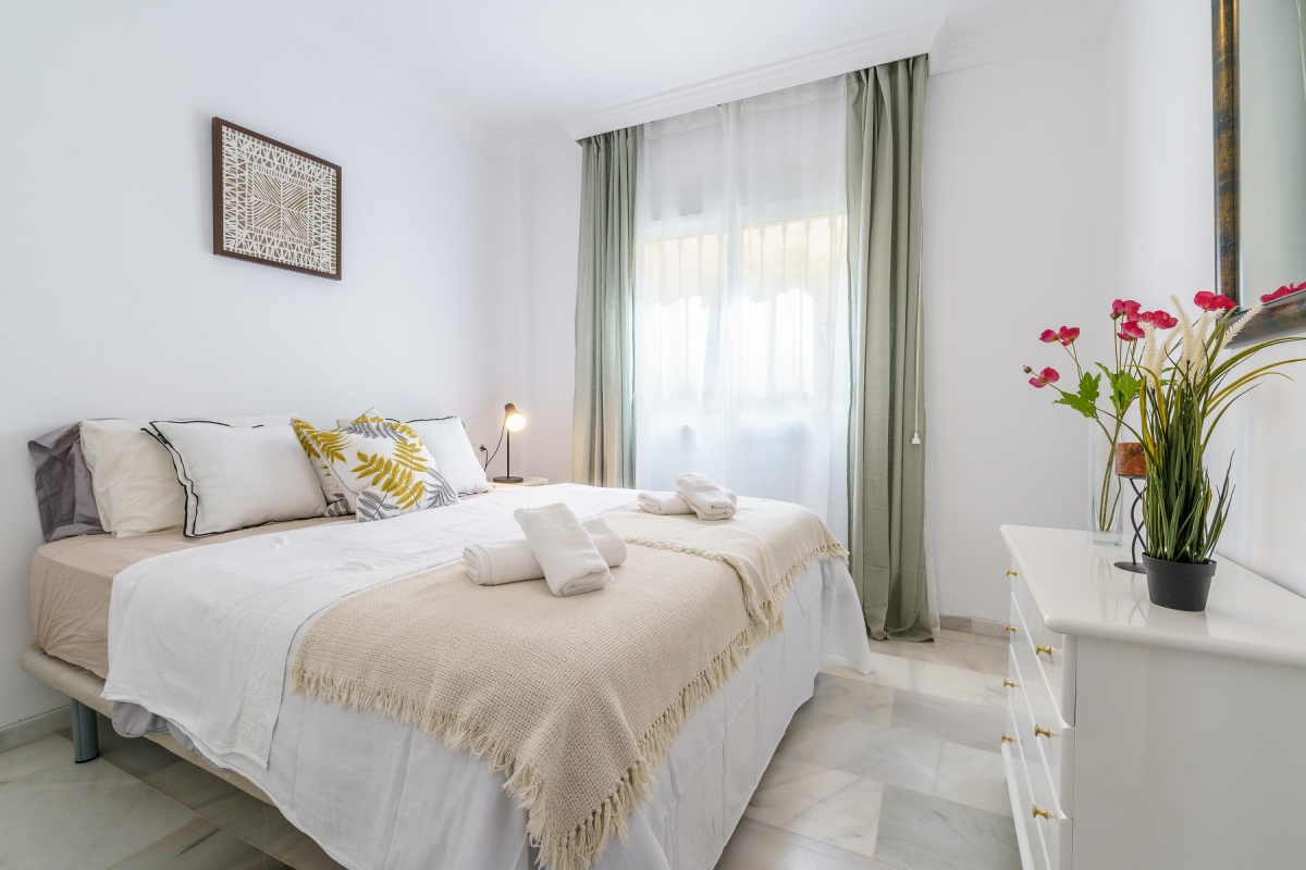 In a gated complex of Calahonda, this holiday apartment on the elevated ground floor can host up to 4 guests and offers access to a massive shared pool and a lush garden for a captivating getaway for couples on a honeymoon. Overlooking the sea, the apartment has a wonderful sunny terrace with sun loungers and an al-fresco dining facility.