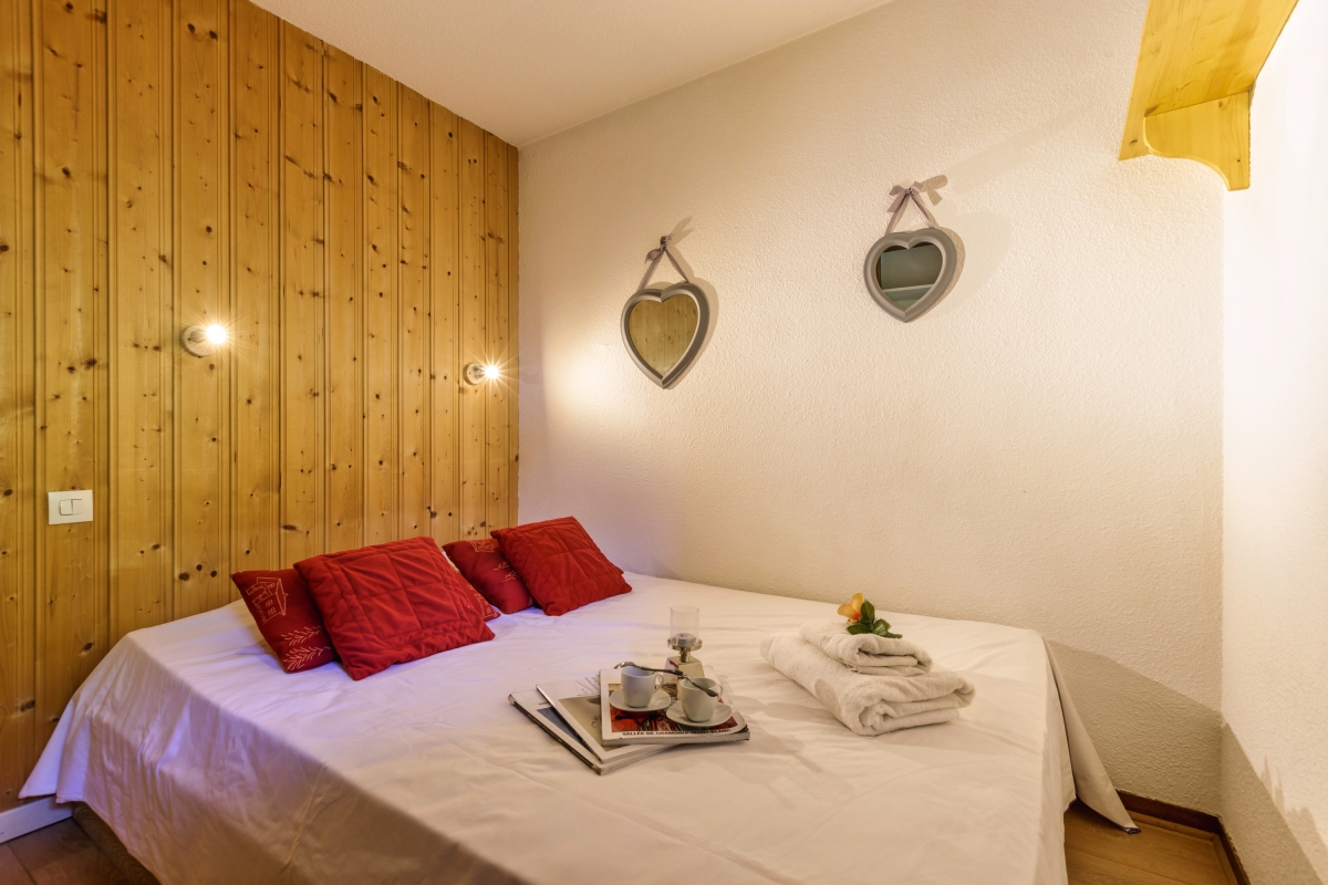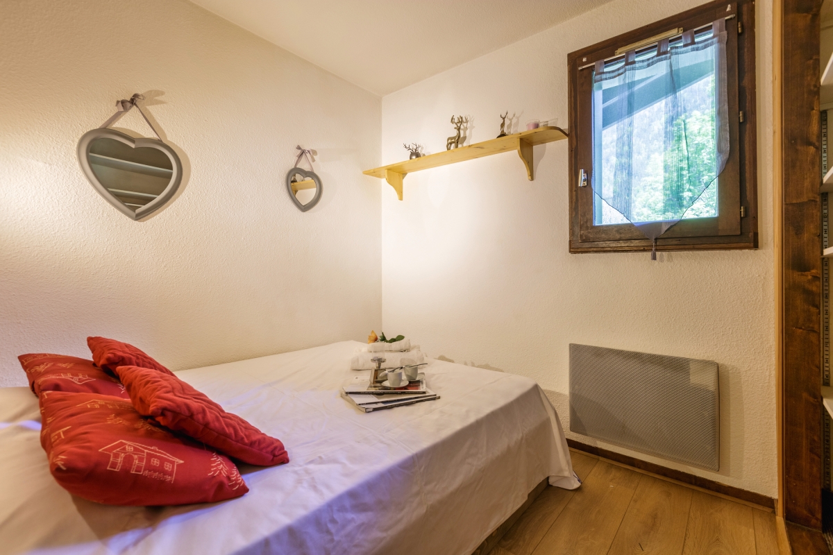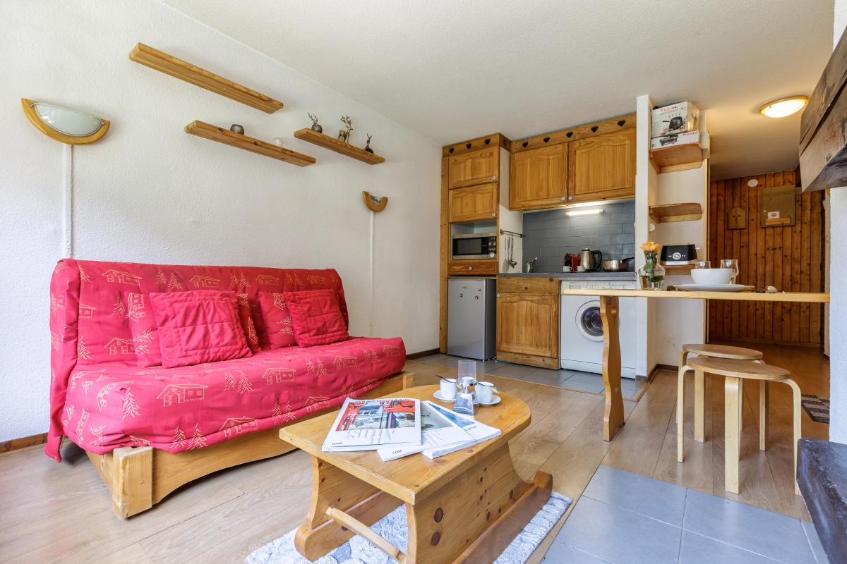 This cosy apartment sleeps 4 people in comfort. There are wooden floors throughout and the décor is full of alpine charm. The main living area has a large window with a glass door leading out onto the private balcony, with a table and 4 chairs, where guests can relax and enjoy the view of the mountains. The living room has a sofa, a covered fireplace and a flat-screen TV. Close by is the wooden dining table which seats 4 people. The kitchenette, next to the dining table, is well equipped with an induction hob, microwave, toaster, nespresso coffee machine, fondue, raclette and fridge.
