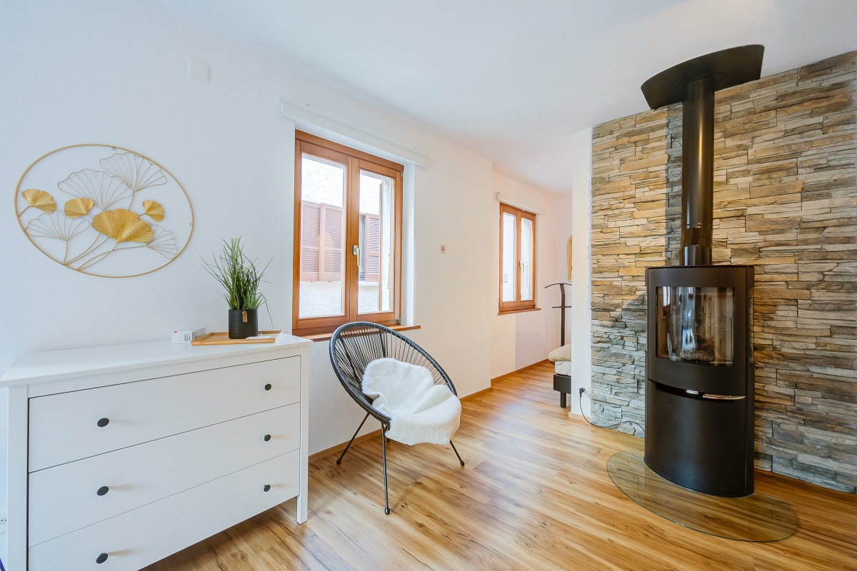 The one-bedroom villa sleeps 4 people and is ideal for a family or group of friends who want to relax in the mountains, and enjoy the great outdoors. The light-filled living area is stylishly furnished with a sofa and two contemporary armchairs. There is a wood-burning stove and a dining table for 4.
